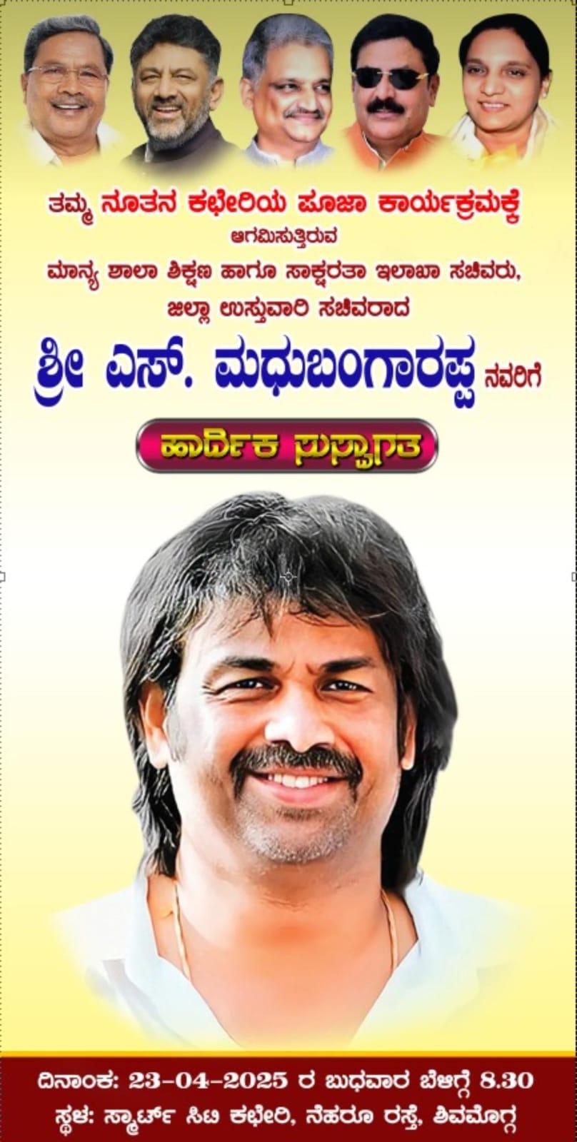 ಶಾಲಾ ಶಿಕ್ಷಣ ಹಾಗೂ ಸಾಕ್ಷರತಾ ಇಲಾಖೆ ಸಚಿವರು ಹಾಗೂ ಜಿಲ್ಲಾ ಉಸ್ತುವಾರಿ ಸಚಿವರಾದ ಸನ್ಮಾನ್ಯ, ಶ್ರೀ ಎಸ್, ಮಧು ಬಂಗಾರಪ್ಪನವರ ಜಿಲ್ಲಾ ಕಚೇರಿಯನ್ನು ಜಿಲ್ಲಾ ಪಂಚಾಯಿತಿ ಕಟ್ಟಡದಿಂದ ನೆಹರು ರಸ್ತೆಯ ಸ್ಮಾರ್ಟ್ ಸಿಟಿ ಕಚೇರಿಗೆ ಸ್ಥಳಾಂತರಿಸುತ್ತಿದ್ದು 23ರ ಬುಧವಾರ ಬೆಳಗ್ಗೆ 7:30 ಗಂಟೆಗೆ ನಡೆಯಲಿರುವ ಪೂಜಾ ಕಾರ್ಯಕ್ರಮಕ್ಕೆ ಮಾನ್ಯ ಸಚಿವರು ಆಗಮಿಸಲಿದ್ದಾರೆ.