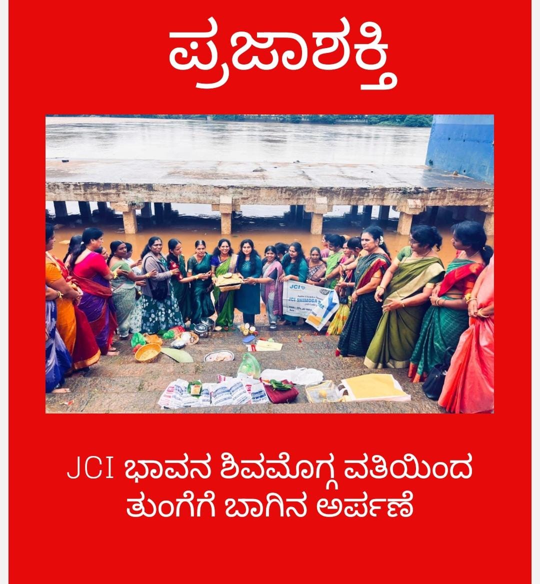 ಶಿವಮೊಗ್ಗ ಜಿಲ್ಲೆಯ ಮಲೆನಾಡಿನ ಜೀವನದಿಯಾದ ತುಂಗಾ ನದಿಯು ರಾಜ್ಯದ ಕೃಷಿ, ಕುಡಿಯುವ ನೀರು ಮತ್ತು ಪರಿಸರ ಸಮತೋಲನದ ಮತ್ತು ಜಾನುವಾರುಗಳಿಗೆ ಪ್ರಮುಖ ಮೂಲವಾಗಿದ್ದು,ಸಕಲ ದೇವಾನುದೇವತೆಗಳ ಅನುಗ್ರಹದಿಂದ ಮಳೆಗೆ ಮೈದುಂಬಿ ಹರಿಯುತ್ತಿರುವ ತುಂಗೆಗೆ ನಗರದ ಕೋರ್ಪಲ್ಲಯ್ಯನ ಛತ್ರದ ತುಂಗಾ ಮಂಟಪದಲ್ಲಿ ಜೆಸಿಐ ಶಿವಮೊಗ್ಗ ಭಾವನದಿಂದ ಅಧ್ಯಕ್ಷರಾದ ಜೆಸಿ ರೇಖಾ ರಂಗನಾಥ್ ರವರ ನೇತೃತ್ವದಲ್ಲಿ ವಿಶೇಷ ಪೂಜೆ ಸಲ್ಲಿಸಿ ಬಾಗಿನ ಅರ್ಪಿಸಲಾಯಿತು.
