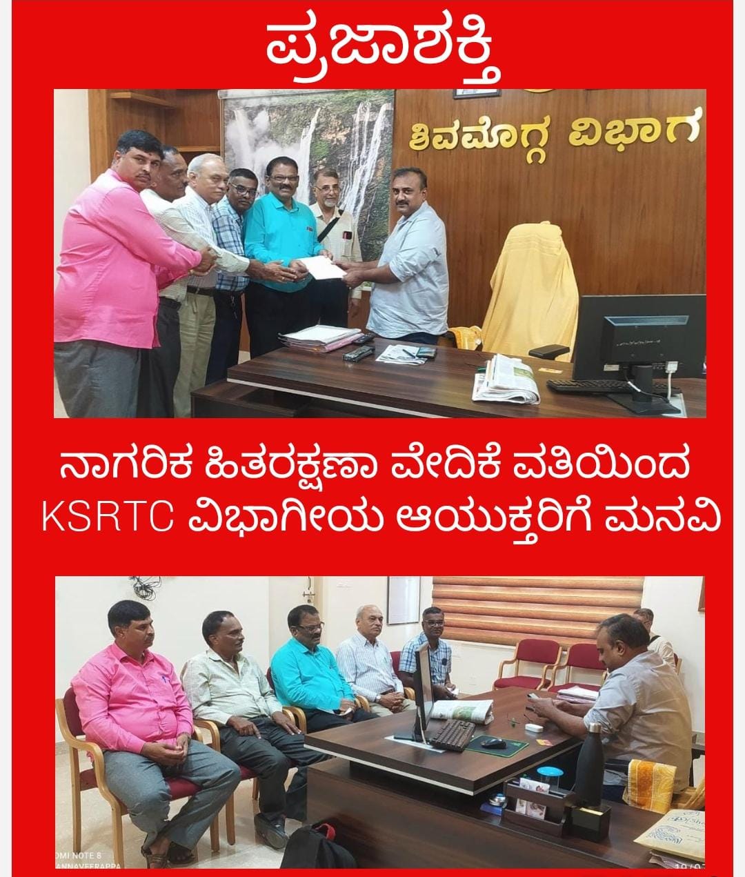 ಶಿವಮೊಗ್ಗ ನಾಗರೀಕ ಹಿತರಕ್ಷಣಾ ವೇದಿಕೆಯ ವತಿಯಿಂದ ಕೆಎಸ್ಸಾರ್ಟಿಸಿ ವಿಭಾಗೀಯ ಆಯುಕ್ತರಿಗೆ ರೈಲ್ವೆ ನಿಲ್ದಾಣಕ್ಕೆ ನಗರ ಸಾರಿಗೆ ಬಸ್ ಬಿಡಲು ಮನವಿ ನೀಡಿದರು.