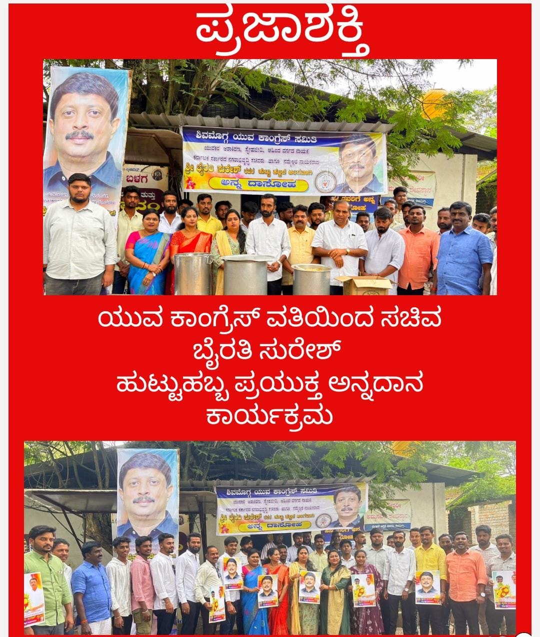 ಕರ್ನಾಟಕ ಸರ್ಕಾರದ ನಗರಾಭಿವೃದ್ಧಿ ಸಚಿವರು, ಅಹಿಂದ ವರ್ಗದ ನಾಯಕ ಬೈರತಿ ಸುರೇಶ್ ರವರ ಹುಟ್ಟುಹಬ್ಬದ ಅಂಗವಾಗಿ ಇಂದು ಶಿವಮೊಗ್ಗ ಯುವ ಕಾಂಗ್ರೆಸ್ ಸಮಿತಿ ವತಿಯಿಂದ ನಗರದ ಮೆಗನ್ ಆಸ್ಪತ್ರೆ ಆವರಣದಲ್ಲಿ ಅನ್ನದಾಸೋಹ ನಡೆಸುವ ಮುಖಾಂತರ ಆಚರಿಸಲಾಯಿತು.