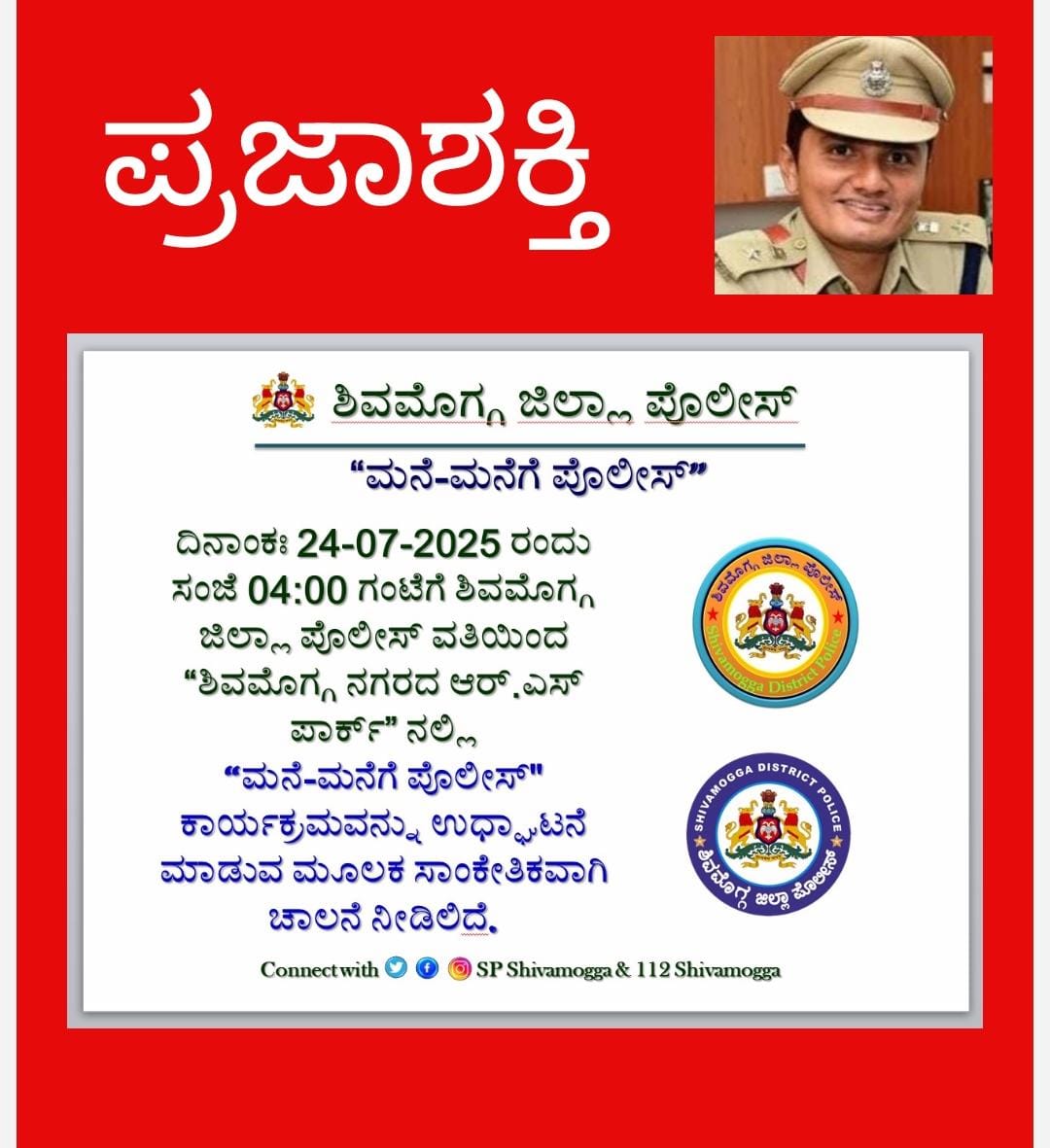 ಸಮುದಾಯ ಪೊಲೀಸ್ ವ್ಯವಸ್ಥೆಯನ್ನು ಬಲಪಡಿಸುವ ನಿಟ್ಟಿನಲ್ಲಿ ಸಾರ್ವಜನಿಕರೊಂದಿಗೆ ಪೊಲೀಸ್ ಇಲಾಖೆಯ ಉತ್ತಮ ಹಾಗೂ ಸ್ನೇಹಪರ ಸಂಬAಧವನ್ನು ಬೆಸೆದು ಸೌಹಾರ್ದ ಸಮಾಜ ನಿರ್ಮಿಸುವ ಉದ್ದೇಶದಿಂದ ‘ಮನೆ ಮನೆಗೆ ಪೊಲೀಸ್’ ಕಾರ್ಯಕ್ರಮ ಜಾರಿಗೊಳಿಸಲಾಗಿದ್ದು, ಜು.24 ರ ಸಂಜೆ 4 ಗಂಟೆಗೆ ಜಿಲ್ಲಾ ಪೊಲೀಸ್ ವತಿಯಿಂದ ನಗರದ ಆರ್ಎಸ್ ಪಾರ್ಕ್ ನಲ್ಲಿ ‘ಮನೆ ಮನೆ ಪೊಲೀಸ್’ ಕಾರ್ಯಕ್ರಮಕ್ಕೆ ಚಾಲನೆ ನೀಡಲಾಗುವುದು.