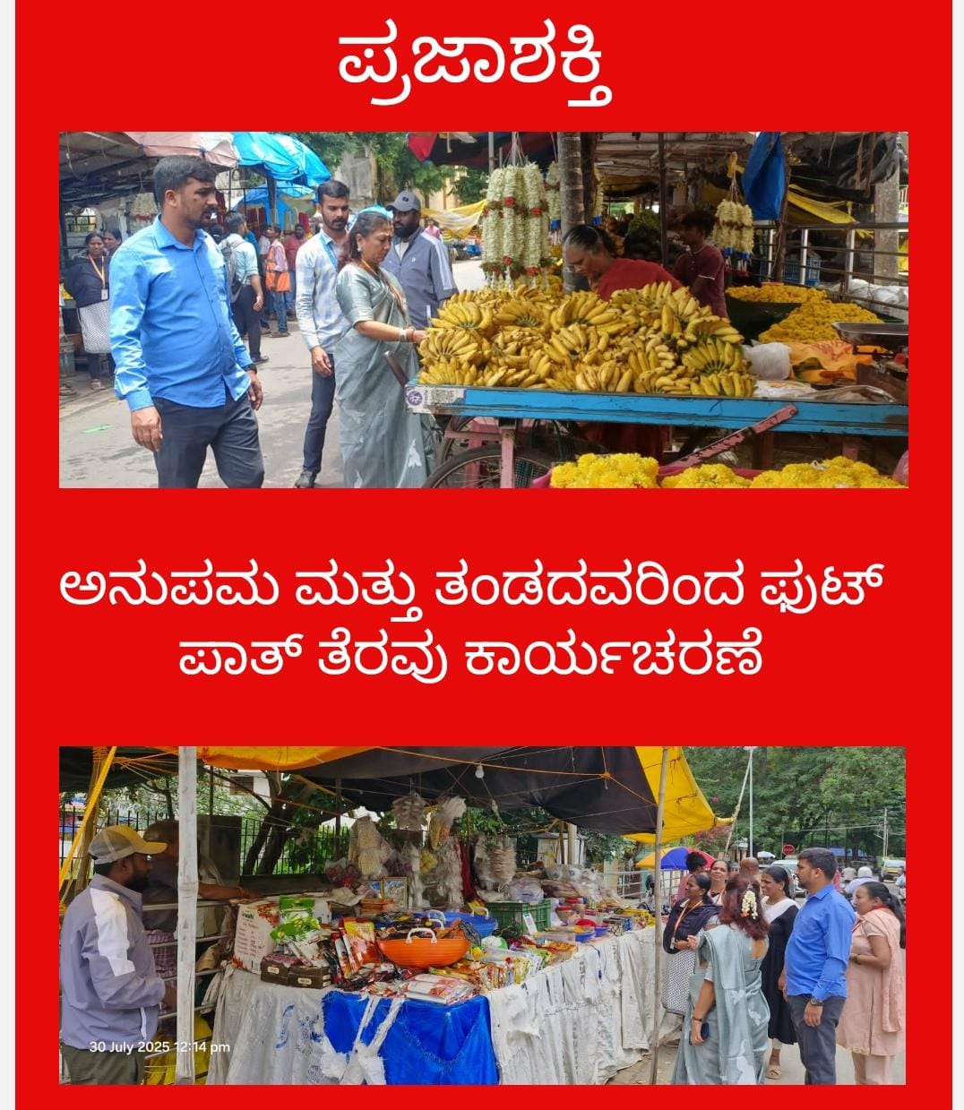 ನಗರದ ವೀರಶೈವ ಕಲ್ಯಾಣ ಮಂದಿರದ ಪಕ್ಕದಲ್ಲಿರುವ ಮತ್ತು ಇತರ ಪ್ರಮುಖ ರಸ್ತೆಯ ಫೂಟ್ ಪಾತ್ ನಲ್ಲಿ ಹಣ್ಣು ಮತ್ತು ಇತರ ವಸ್ತುಗಳ ವ್ಯಾಪಾರ ಮಾಡುತ್ತಿದ್ದರು. ಈ ಸಮಯದಲ್ಲಿ ಪಾಲಿಕೆ ಅಧಿಕಾರಿ ಅನುಪಮಾ ರವರು ಸ್ಥಳಕ್ಕೆ ಭೇಟಿ ನೀಡಿ ವ್ಯಾಪಾರಸ್ಥರಿಗೆ ಇಟ್ಕೊಂಡಿರುವ ಹಣ್ಣುಗಳನ್ನು ಹಿಂದಕ್ಕೆ ಇಟ್ಟುಕೊಂಡಿ ವ್ಯಾಪಾರ ಮಾಡುವಂತೆ ಸೂಚನೆ ನೀಡಿದರು.ಮತ್ತು ಸಾರ್ವಜನಿಕರಿಗೆ ಆಗುವ ಅನಾನುಕೂಲಗಳು ಬಗ್ಗೆ ತಿಳಿಸುವ ಮೂಲಕ ವ್ಯಾಪರಿಸ್ತರಿಗೆ ತಿಳಿ ಹೇಳಿದರು.