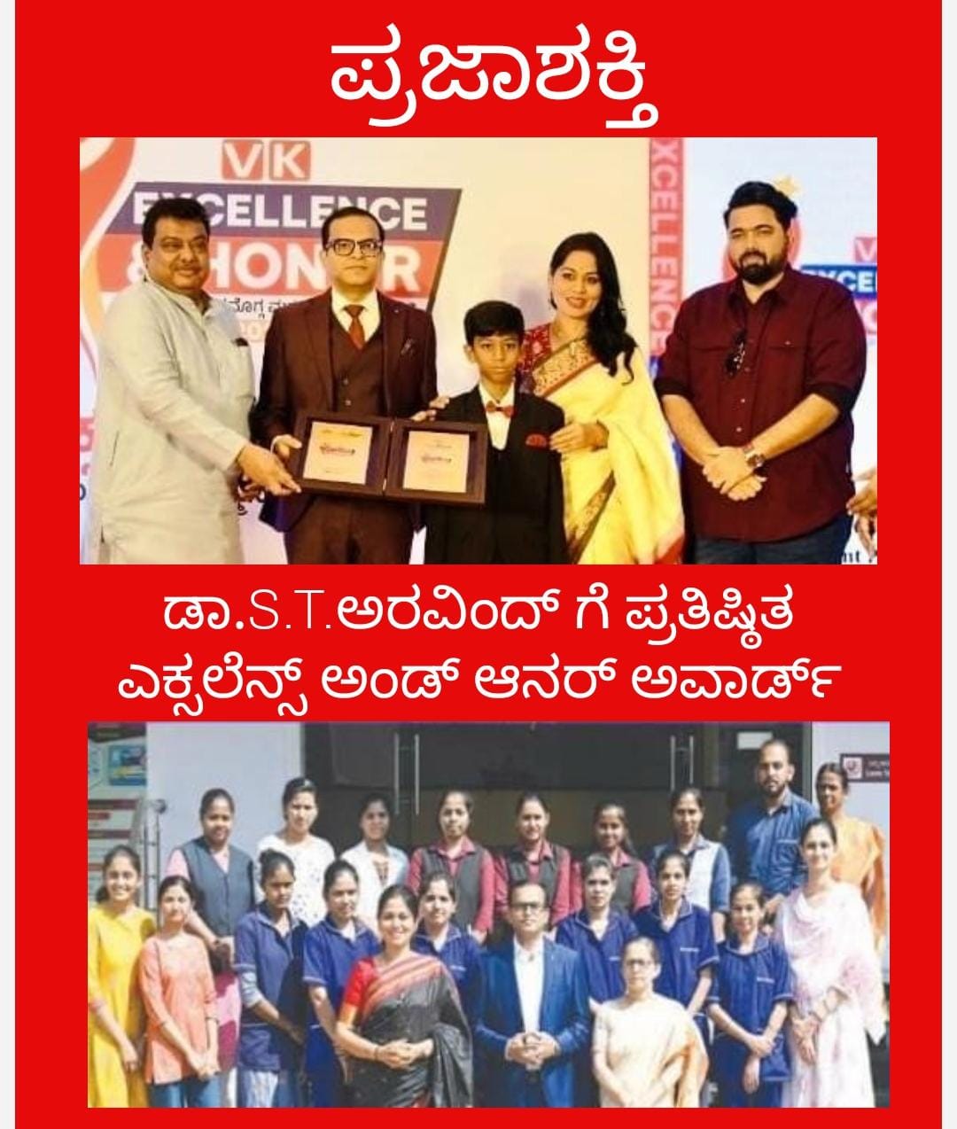 ಡಾ.S.T. ಅರವಿಂದ್ ಗೆ ಪ್ರತಿಷ್ಠಿತ ಎಕ್ಸಲೆನ್ಸ್ ಅಂಡ್ ಆನರ್ ಅವಾರ್ಡ್ ಪ್ರಶಸ್ತಿ ದೊರೆತಿದೆ. ವಿಜಯ್ ಕರ್ನಾಟಕ ಪತ್ರಿಕೆ ವತಿಯಿಂದ ನೀಡುವ ರಾಜ್ಯ ಮಟ್ಟದ ಪ್ರತಿಷ್ಠಿತ ಎಕ್ಸಲೆನ್ಸ್ ಅಂಡ್ ಆನರ್ ಅವಾರ್ಡ್ ಪ್ರಶಸ್ತಿ ನೀಡಿ ಗೌರವಿಸಲಾಗಿದೆ.