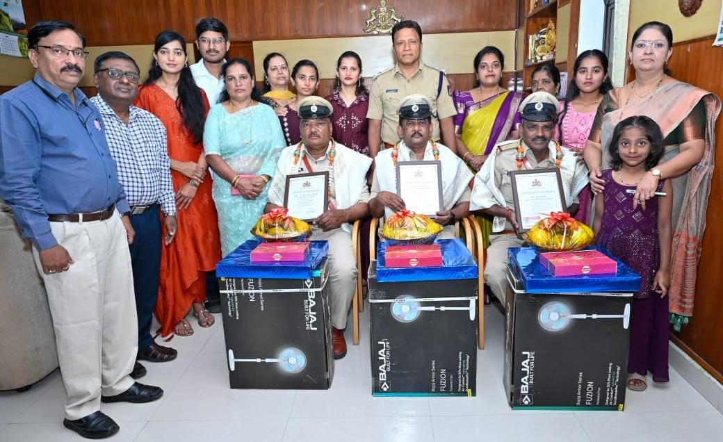 1. ಶ್ರೀ ಎಲ್. ಕೃಷ್ಣಾ ನಾಯ್ಕ , ಪಿಎಸ್ಐ, ಹೊಳೆಹೊನ್ನೂರು ಪೊಲೀಸ್ ಠಾಣೆ, 2. ರಮೇಶ ಎ , ಎಎಸ್ಐ , ವಿನೋಬನಗರ ಪೊಲೀಸ್ ಠಾಣೆ, 3. ಶ್ರೀ ರಮೇಶ , ಎಎಸ್ಐ , ಹೊಸನಗರ ಪೊಲೀಸ್ ಠಾಣೆ, ಶಿವಮೊಗ್ಗ ಇವರುಗಳು ಶಿವಮೊಗ್ಗ ಜಿಲ್ಲಾ ಪೊಲೀಸ್ ಇಲಾಖೆಯಲ್ಲಿ ಸುಧೀರ್ಘ ಸೇವೆಯನ್ನು ಸಲ್ಲಿಸಿ 31ರಂದು ವಯೋನಿವೃತ್ತಿಯನ್ನು ಹೊಂದಿದ್ದು, ಇವರಿಗೆ ಶಿವಮೊಗ್ಗ ಜಿಲ್ಲಾ ಪೊಲೀಸ್ ವತಿಯಿಂದ ಶ್ರೀ ಅನಿಲ್ ಕುಮಾರ್ ಭೂಮರಡ್ಡಿ, ಹೆಚ್ಚುವರಿ ಪೊಲೀಸ್ ಅಧೀಕ್ಷಕರು, - 1 ಶಿವಮೊಗ್ಗ ಜಿಲ್ಲೆ ರವರು ನೆನಪಿನ ಕಾಣಿಕೆಯನ್ನು ನೀಡಿ ಸನ್ಮಾನಿಸಿ ಮುಂದಿನ ನಿವೃತ್ತಿ ಜೀವನವು ಸುಖಕರವಾಗಿರಲಿ ಎಂದು ಶುಭ ಕೋರಿ ಬೀಳ್ಕೊಡುಗೆ ನೀಡಿದರು.