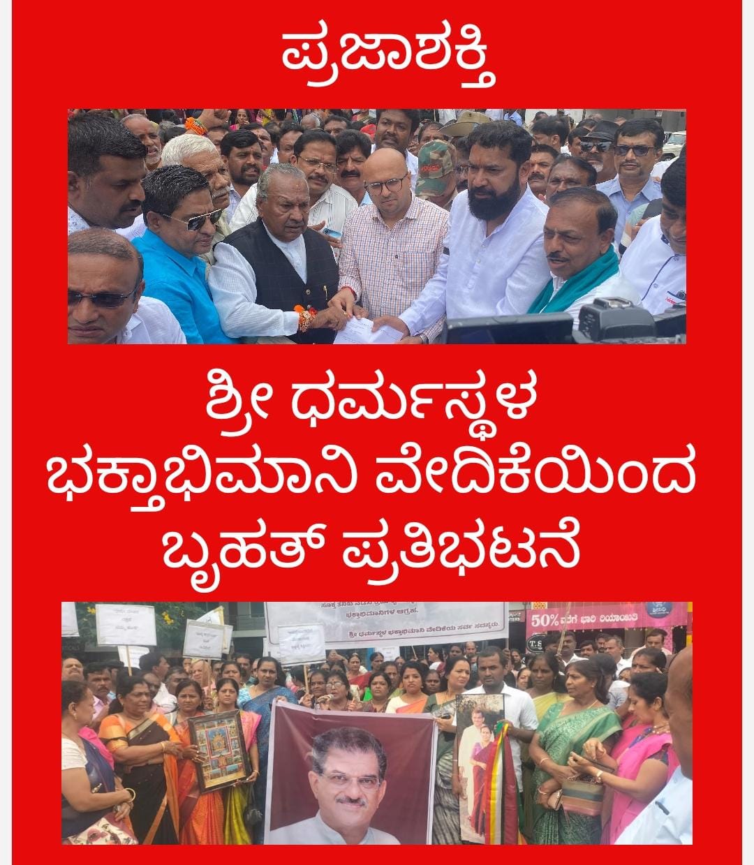 ಧರ್ಮಸ್ಥಳದಲ್ಲಿ ಉತ್ಕನ ಮಾಡುವುದನ್ನು ಖಂಡಿಸಿ ಶ್ರೀ ಧರ್ಮಸ್ಥಳ ಭಕ್ತಾಭಿಮಾನಿ ವೇದಿಕೆ ವತಿಯಿಂದ ಬೃಹತ್ ಪ್ರತಿಭಟನೆ ನಡೆಸಿತು. ಅನಾಮಿಕನನ್ನ ಬಂಧಿಸುವಂತೆ ಆಗ್ರಹಿಸಿ ಪ್ರತಿಭಟನಾಕಾರರು ಘೋಷಣೆ ಕೂಗಿದರು.ಗೋಪಿ ವೃತ್ತದಿಂದ ಪ್ರತಿಭಟನೆ ನಡೆಸಿದ ಪ್ರತಿಭಟನಾಕಾರರು ಉತ್ಕನನವನ್ನು ವರದಿಯನ್ನು ನಿಲ್ಲಿಸುವಂತೆ ಅಗ್ರಹಿಸಿ ಜಿಲ್ಲಧಿಕಾರಿಗಳಿಗೆ ಮನವಿ ಸಲ್ಲಿಸಿದರು.