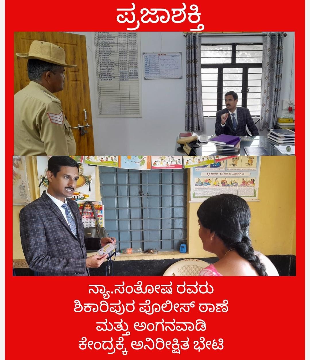 ಜಿಲ್ಲಾ ಕಾನೂನು ಸೇವೆಗಳ ಪ್ರಾಧಿಕಾರದ ಸದಸ್ಯ ಕಾರ್ಯದರ್ಶಿಗಳು ಹಾಗೂ ಹಿರಿಯ ಸಿವಿಲ್ ನ್ಯಾಯಾಧೀಶರು ಆದ ಸಂತೋಷ್ ಎಂ ಎಸ್ ರವರು ಶಿಕಾರಿಪುರ ನಗರ ಪೊಲೀಸ್ ಠಾಣೆಗೆ ಅನಿರೀಕ್ಷಿತ ಭೇಟಿ ನೀಡಿ ಅಲ್ಲಿನ ವಹಿಗಳನ್ನು ಮತ್ತು ಪೊಲೀಸ್ ಠಾಣೆಯ ತಪಾಸಣೆ ಮಾಡಿದರು.