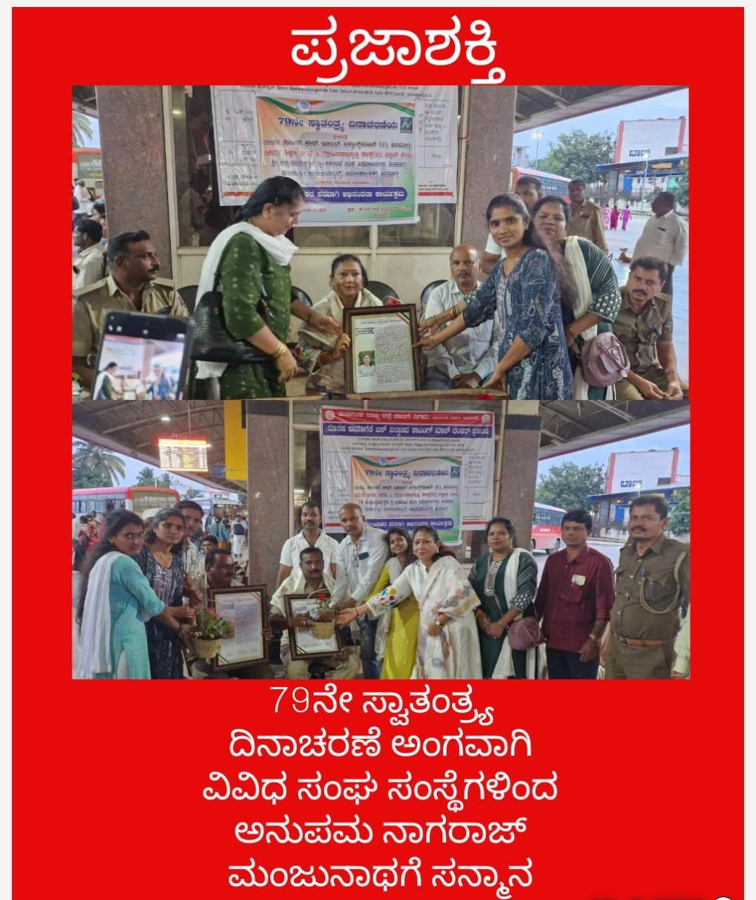 ಕಾರ್ಯಕ್ರಮದಲ್ಲಿ ಶಿವಮೊಗ್ಗ ಮಹಾನಗರ ಪಾಲಿಕೆಯಲ್ಲಿ ಉತ್ತಮ ಕರ್ತವ್ಯ ನಿರ್ವಹಿಸಿ ಸೇವೆ ಸಲ್ಲಿಸುತ್ತಿರುವ ಸಮುದಾಯದ ವ್ಯವಹಾರಿಕಯಾದ ಶ್ರೀಮತಿ ಅನುಪಮಾ.T.R. ಮತ್ತು ಕೋಲಾರ ವಿಭಾಗ ದಿಂದ ಕೊಲ್ಲೂರು ಹೋಗುವ ಕ.ರಾ.ರ. ಸಾ.ಸಂಸ್ಥೆ. ಬಸ್ ಚಾಲಕರಾದ ಶ್ರೀ ನಾಗರಾಜ್ & ನಿರ್ವಹಕರಾದ ಶ್ರೀ ಶ್ರೀ ಮಂಜುನಾಥ್.K. ರವರುಗಳು ಉತ್ತಮ ಕರ್ತವ್ಯ ನಿರ್ವಹಿಸುತ್ತಿರುವ ಹಿನ್ನೆಲೆಯಲ್ಲಿ ಸಾರ್ವಜನಿಕರಲ್ಲಿ ಅಭಿಪ್ರಾಯ ಪಡೆದು ಸಂಸ್ಥೆಗಳಿಂದ ಸಮೀಕ್ಷೆ ನಡೆಸಿ ಅಭಿನಂದನ ಪತ್ರ ನೀಡಿ ಸನ್ಮಾನಿಸಲಾಯಿತು.