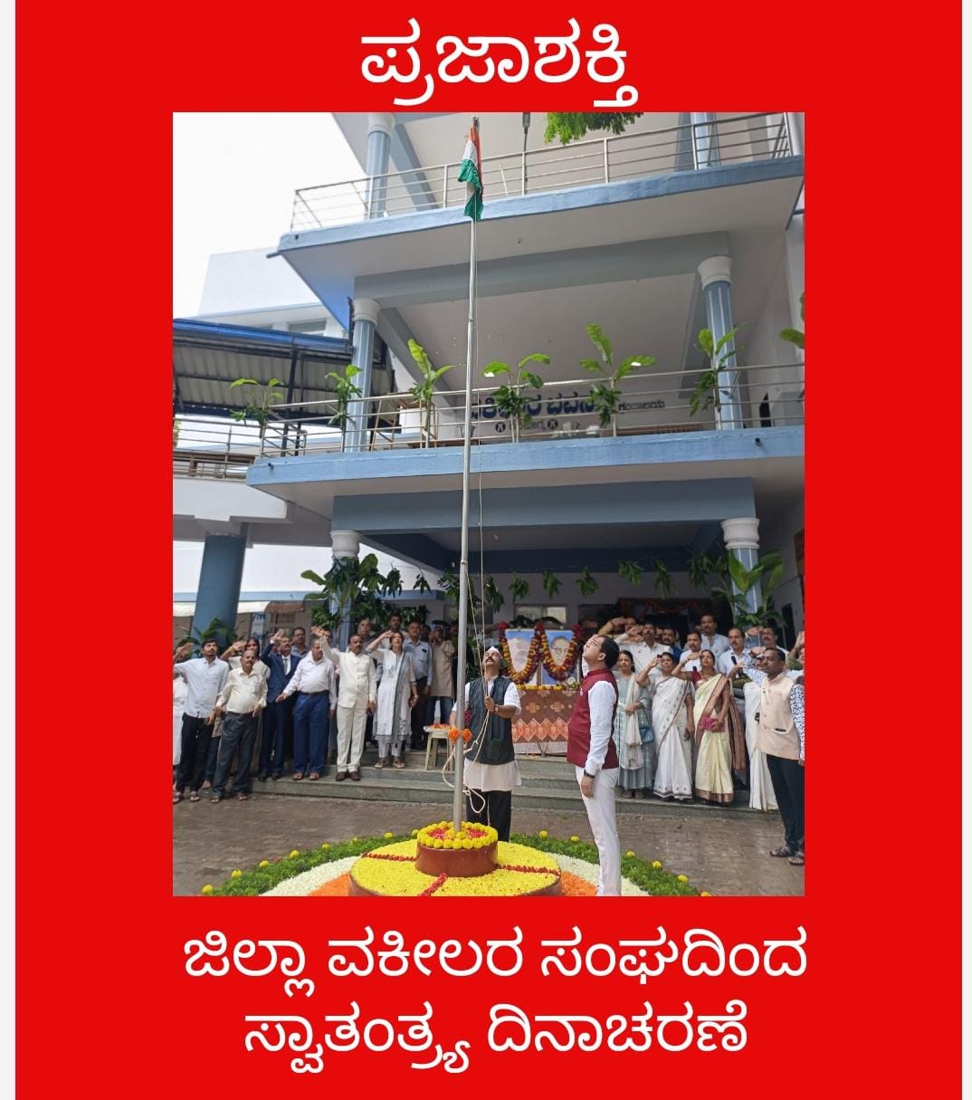 ಜಿಲ್ಲಾ ವಕೀಲರ ಸಂಘದ ವತಿಯಿಂದ 79ನೇ ಸ್ವಾತಂತ್ರ್ಯ ದಿನಾಚರಣೆಯನ್ನು ಆಚರಿಸಲಾಯಿತು.ಅಧ್ಯಕ್ಷರಾದ ಜಿ ಆರ್ ರಾಘವೇಂದ್ರ ಸ್ವಾಮಿ ಅವರು ವಕೀಲರ ಭವನದಲ್ಲಿ ಧ್ವಜಾರೋಹಣ ಕಾರ್ಯಕ್ರಮವನ್ನು ನೆರವೇರಿಸಿದರು.