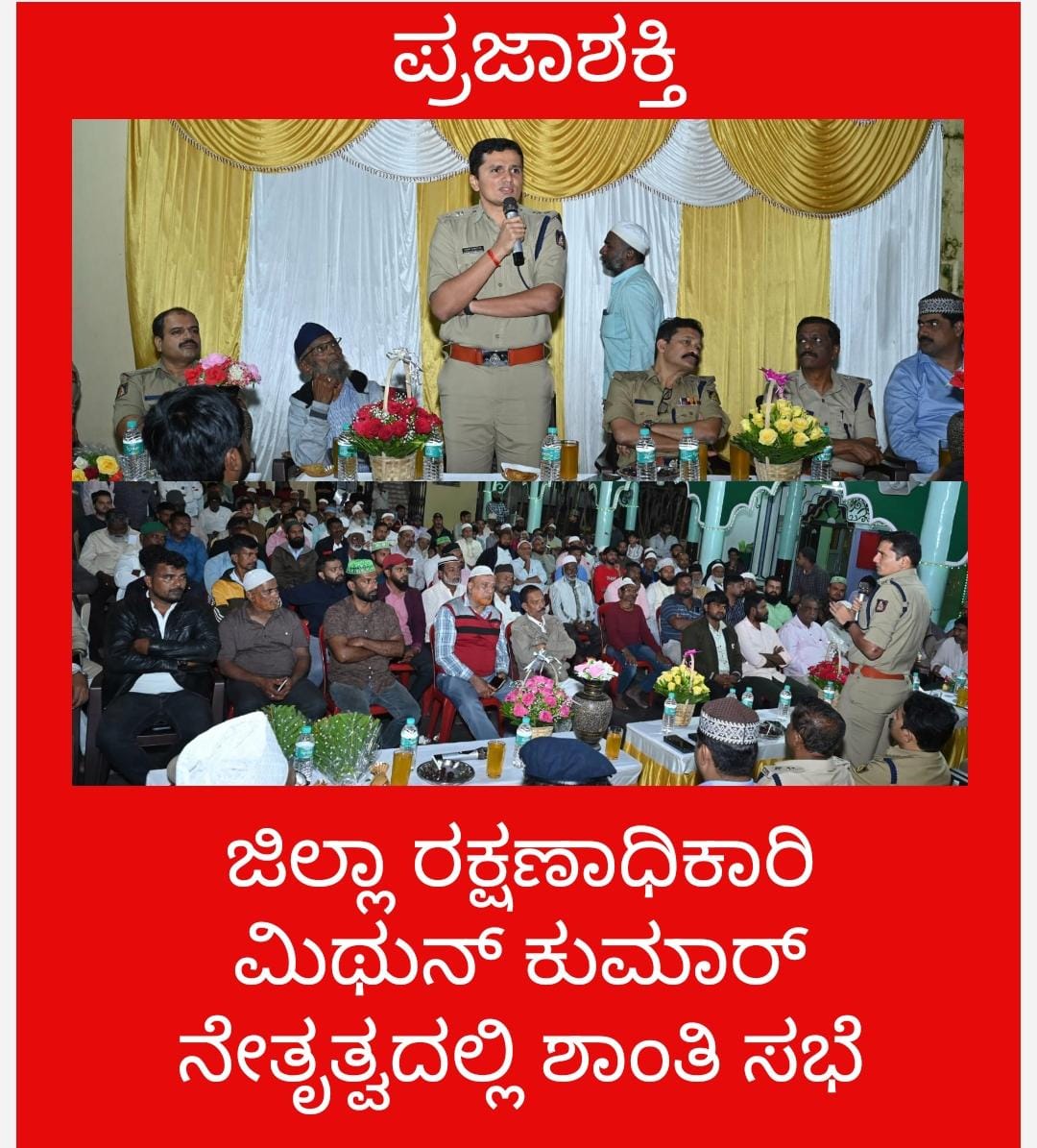 ಮುಂಬರುವ ಈದ್ ಮಿಲಾದ್ ಹಾಗೂ ಗೌರಿ ಗಣೇಶ ಹಬ್ಬದ ಹಿನ್ನೆಲೆಯಲ್ಲಿ ಶ್ರಿ ಮಿಥುನ್ ಕುಮಾರ್ ಜಿ.ಕೆ.ಪೊಲೀಸ್ ಅಧೀಕ್ಷಕರು, ಶಿವಮೊಗ್ಗ ಜಿಲ್ಲೆ ರವರ ನೇತೃತ್ವದಲ್ಲಿ, ಶಿವಮೊಗ್ಗ ನಗರದ ಗಾಂಧಿ ಬಜಾರ್ ಸುನ್ನಿ ಜಾಮಿಯಾ ಮಸೀದಿ ಯಲ್ಲಿ ಶಾಂತಿ ಸಭೆಯನ್ನು ಆಯೋಜಿಸಿ ಈ ಕೆಳಕಂಡ ಸಲಹೆ ಸೂಚನೆಗಳನ್ನು ನೀಡಿರುತ್ತಾರೆ.