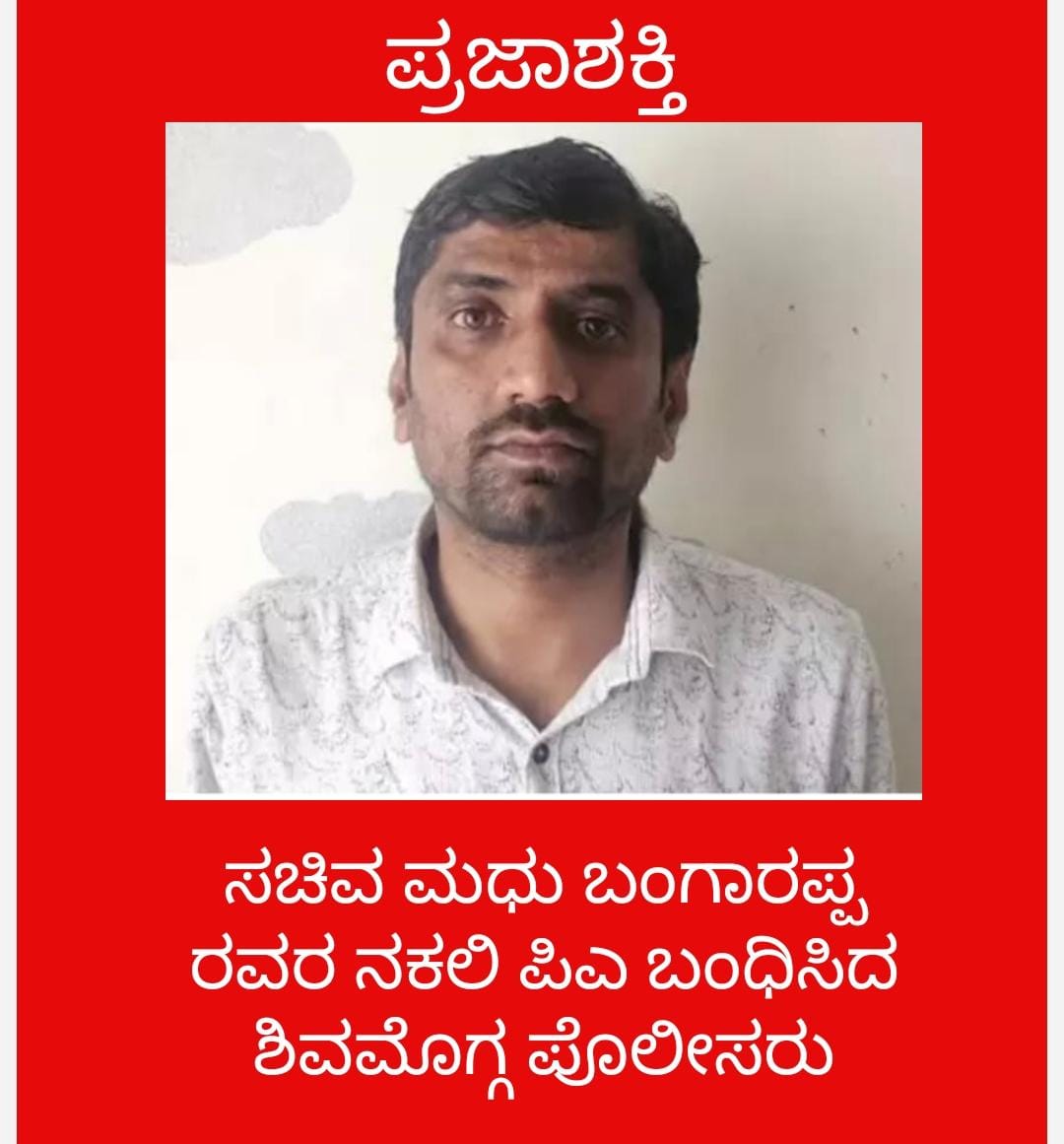 ಶಿಕ್ಷಣ ಸಚಿವರಾದ ಮಧು ಬಂಗಾರಪ್ಪ ಅವರ ಹೆಸರನ್ನು ದುರ್ಬಳಕೆ ಮಾಡಿಕೊಂಡು ಸರ್ಕಾ ರಿ ನೌಕರರಿಗೆ ವರ್ಗಾವಣೆ ಮಾಡಿಸಿಕೊಡುವುದಾಗಿ ವಂಚಿ ಸುತ್ತಿದ್ದ ಆರೋಪಿಯನ್ನು ಶಿವಮೊಗ್ಗದ ಜಯನಗರ ಪಿಐ ಸಿದ್ದೇಗೌಡರ ತಂಡವು ಬಂಧಿಸಿದ್ದಾರೆ.ಬಂಧಿತ ಆರೋಪಿಯನ್ನು ರಘುನಾಥ್ ಎಂದು ಗುರುತಿಸಲಾಗಿದೆ.