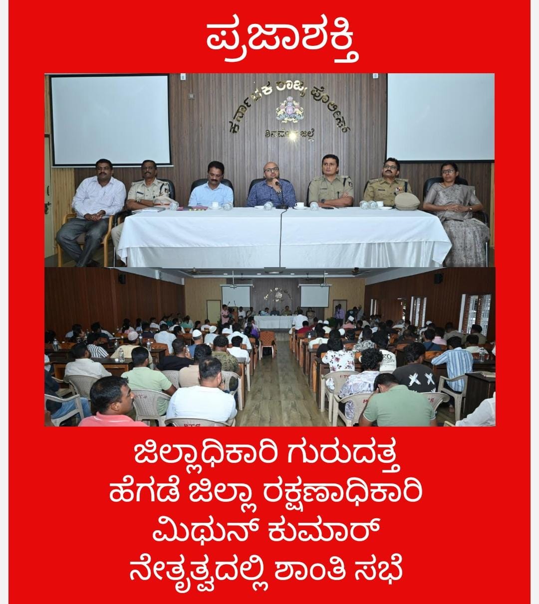 ಮುಂಬರುವ ಈದ್ ಮಿಲಾದ್ ಹಾಗೂ ಗೌರಿ ಗಣೇಶ ಹಬ್ಬದ ಹಿನ್ನೆಲೆಯಲ್ಲಿ ಶ್ರೀ ಗುರುದತ್ ಹೆಗ್ಡೆ, ಐಎಎಸ್, ಜಿಲ್ಲಾಧಿಕಾರಿಗಳು, ಶಿವಮೊಗ್ಗ ಜಿಲ್ಲೆ, ಶ್ರೀ ಮಿಥುನ್ ಕುಮಾರ್ ಜಿ,ಕೆ, ಪೊಲೀಸ್ ಅಧೀಕ್ಷಕರು, ಶಿವಮೊಗ್ಗ ಜಿಲ್ಲೆ ರವರ ನೇತೃತ್ವದಲ್ಲಿ, ಶಿವಮೊಗ್ಗ ನಗರದ ಡಿಎಆರ್ ಪೊಲೀಸ್ ಸಭಾಂಗಣದಲ್ಲಿ ಶಾಂತಿ ಸಭೆಯನ್ನು ಆಯೋಜಿಸಲಾಗಿರುತ್ತದೆ.ಸದರಿ ಸಭೆಗೆ ಶ್ರೀ ಮಾಯಣ್ಣ ಗೌಡ, ಕಮಿಷನರ್ ನಗರಸಭೆ, ಶಿವಮೊಗ್ಗ, ಶ್ರೀ ರಾಜೀವ್ ತಹಶೀಲ್ದಾರ್, ಶಿವಮೊಗ್ಗ ಶ್ರೀಮತಿ ಸುಜಾತ ಜಿಲ್ಲಾ ಪಂಚಾಯತ್ ಉಪಾಧ್ಯಕ್ಷರು, ಶ್ರೀ ಕಾರಿಯಪ್ಪ ಎ.ಜಿ, ಹೆಚ್ಚುವರಿ ಪೊಲೀಸ್ ಅಧೀಕ್ಷಕರು – 1 ಶಿವಮೊಗ್ಗ ಶ್ರೀ ಎಸ್ ರಮೇಶ್ ಕುಮಾರ್ ಹೆಚ್ಚುವರಿ ಪೊಲೀಸ್ ಅಧೀಕ್ಷಕರು – 2 ಶಿವಮೊಗ್ಗ ರವರು ಉಪಸ್ಥಿತರಿದ್ದರು.