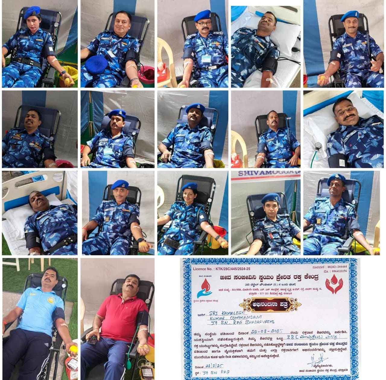 ಶಿವಮೊಗ್ಗ ಜಿಲ್ಲಾ ಪೊಲೀಸ್ ಹಾಗು ಆರ್.ಎ.ಎಫ್ (Rapid Action Force) BN 97. ಭದ್ರಾವತಿ ರವರ ಸಂಯುಕ್ತ ಆಶ್ರಯದಲ್ಲಿ ಭದ್ರಾವತಿಯ ಜೀವ ಸಂಜೀವಿನಿ ರಕ್ತ ಕೇಂದ್ರ ರವರ ಸಹಯೋಗದೊಂದಿಗೆ ಎಂ.ಪಿ.ಎಂ. ಕಾರ್ಖಾನೆಯ ಆವರಣದಲ್ಲಿರುವ Rapid Action Force BN 97 ಆವರಣದಲ್ಲಿ ಶಿವಮೊಗ್ಗ ಜಿಲ್ಲಾ ಪೊಲೀಸ್ ನ 54 ನೇ ಹಾಗು ಈ ತಿಂಗಳ 08ನೇ ರಕ್ತದಾನ ಶಿಬಿರ ಆಯೋಜಿಸಿದ್ದು ಶಿಬಿರದಲ್ಲಿ Rapid Action Force ನ 33 ಜನ ಅಧಿಕಾರಿಗಳು ಮತ್ತು 05 ಜನ ಸಾರ್ವಜನಿಕರು ರಕ್ತದಾನ ಮಾಡಿದ್ದು ಒಟ್ಟು 38 ಜನ ರಕ್ತದಾನ ಮಾಡಿರುತ್ತಾರೆ
