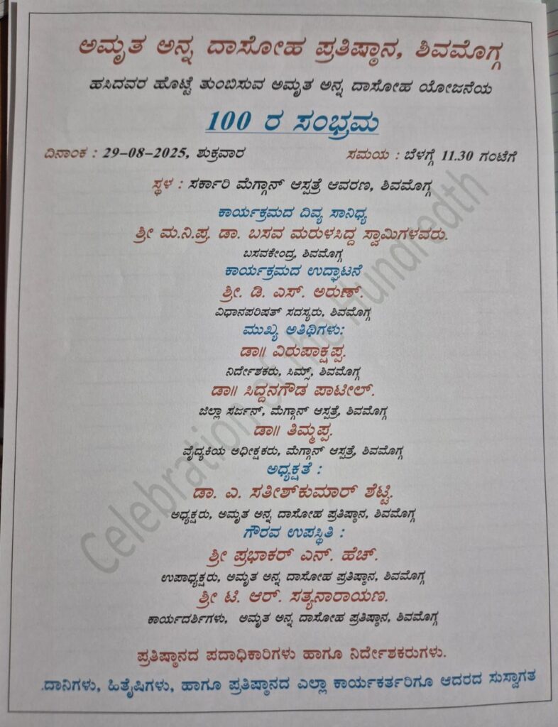 ಈ ಸಂದರ್ಭದಲ್ಲಿ ಮಾತನಾಡಿದ ಅನ್ನದಾಸೋಹದ ಪ್ರಮುಖರು ಕಳೆದ ವರ್ಷ ಸೆಪ್ಟೆಂಬರ್ ನಲ್ಲಿ ಪ್ರಾರಂಭವಾದ ಅನ್ನದಾನ ಕಾರ್ಯಕ್ರಮ ನಾಳೆಗೆ ನೂರು ದಿನ ಪೂರೈಸಲಿದೆ. ಮಲೆನಾಡಿನ ಶಿವಮೊಗ್ಗದಲ್ಲಿ ಪ್ರಪ್ರಥಮ ಬಾರಿಗೆ ಪ್ರಾರಂಭವಾದ ಅನ್ನದಾಸೋಹ ಕಾರ್ಯಕ್ರಮಕ್ಕೆ ನಿರೀಕ್ಷೆಗೂ ಮೀರಿ ಸಹಕಾರ ಸಿಕ್ಕಿದೆ. ಶಿವಮೊಗ್ಗದಲ್ಲಿ ಮೊದಲ ಬಾರಿಗೆ ಐತಿಹಾಸಿಕ ಕಾರ್ಯಕ್ರಮವಾಗಿ ಹೊರಹೊಮ್ಮಿದೆ.ಅನ್ನದಾನ ಕಾರ್ಯಕ್ರಮಕ್ಕೆ ಸಹಕಾರ ನೀಡಿದ ವಿಶೇಷವಾಗಿ ದಾನಿಗಳಿಗೆ ಮತ್ತು ಕಾರ್ಯಕರ್ತರಿಗೆ ಹೃದಯಪೂರ್ವಕ ಅಭಿನಂದನೆಗಳು ತಿಳಿಸಿದರು.