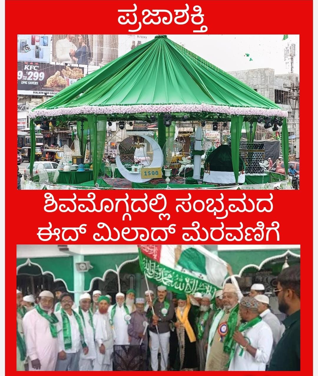 ಶಿವಮೊಗ್ಗ ನಗರದಲ್ಲಿ ಈದ್ ಮಿಲಾದ್ ಮೆರವಣಿಗೆ ಅದ್ಧೂರಿಯಾಗಿ ಜರುಗಿತು. ರಾಜ್ಯದ ಬೇರೆ ಜಿಲ್ಲೆಗಳು ಸೇರಿದಂತೆ ವಿವಿಧೆಡೆಯಿಂದ ದೊಡ್ಡ ಸಂಖ್ಯೆಯ ಮುಸ್ಲಿಮರು ಮೆರವಣಿಗೆಯಲ್ಲಿ ಪಾಲ್ಗೊಂಡಿದ್ದರು.