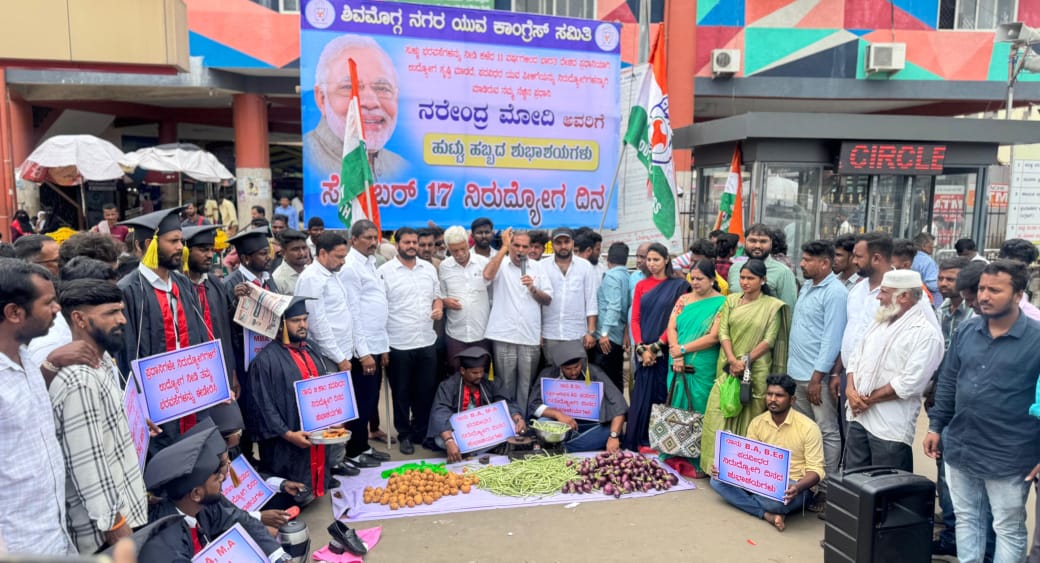 ದೇಶದಲ್ಲಿ ವರ್ಷಕ್ಕೆ 2 ಕೋಟಿ ಉದ್ಯೋಗ ಸೃಷ್ಟಿಸುತ್ತೇವೆಂದು ಹೇಳಿ ಕೇಂದ್ರದಲ್ಲಿ ಮೂರು ಬಾರಿ ಅಧಿಕಾರದ ಚುಕ್ಕಾಣಿ ಹಿಡಿದ ನರೇಂದ್ರ ಮೋದಿಯವರ ನೇತೃತ್ವದ ಕೇಂದ್ರ ಸರ್ಕಾರ ಎರಡು ಅವಧಿ ಮುಗಿಸಿ ಮೂರನೇ ಅವಧಿಯ ವರ್ಷದ ಸಂಭ್ರಮಾಚರಣೆ ಆಚರಿಸಿದರೂ ಒಂದೇ ಒಂದು ಉದ್ಯೋಗ ಸೃಷ್ಟಿ ಮಾಡದೇ ದೇಶದಲ್ಲಿ ನಿರುದ್ಯೋಗ ತಾಂಡವವಾಡುವ ಪರಿಸ್ಥಿತಿ ನಿರ್ಮಾಣ ಮಾಡಿದ್ದು, ಇದನ್ನು ಶಿವಮೊಗ್ಗ ನಗರ ಯುವ ಕಾಂಗ್ರೆಸ್ ತೀವ್ರವಾಗಿ ಖಂಡಿಸುತ್ತದೆ ಎಂದರು.