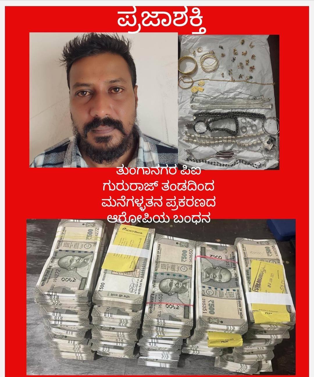 ಶಿವಮೊಗ್ಗ ತುಂಗಾನಗರ ಪೊಲೀಸ್ ಠಾಣೆಯ ಗುನ್ನೆ ಸಂಖ್ಯೆ 0545/2025 ಕಲಂ 331(3), 305, ಬಿ.ಎನ್.ಎಸ್ ರಲ್ಲಿ ದಿನಾಂಕ 17/9/2025 ರಂದು ಗೊಪಾಲ ಗೌಡ ಬಡಾವಣೆ ಸಿ ಬ್ಲಾಕ್ ನಲ್ಲಿ ಹಗಲು ಸಮಯದಲ್ಲಿ ಮನೆಗಳ್ಳತನ ನಡೆದಿದ್ದು ಈ ಪ್ರಕರಣಕ್ಕೆ ಸಂಬಂದಿಸಿದಂತೆ ಪೊಲೀಸ್ ಅಧೀಕ್ಷಕರಾದ ಶ್ರೀ ಮಿಥುನ್ ಕುಮಾರ್ ಜಿ. ಕೆ. ಐಪಿಎಸ್ ಮತ್ತು ಹೆಚ್ಚುವರಿ ಪೊಲೀಸ್ ಅಧೀಕ್ಷಕರುಗಳಾದ ಶ್ರೀ ಎ ಜಿ ಕಾರಿಯಪ್ಪ ಮತ್ತು ಶ್ರೀ ರಮೇಶ ಕುಮಾರ್ ಹಾಗೂ ಪೊಲೀಸ್ ಉಪಾಧೀಕ್ಷಕರಾದ ಶ್ರೀ ಬಾಬು ಆಂಜನಪ್ಪ ರವರ ಮಾರ್ಗದರ್ಶನದಲ್ಲಿ ತುಂಗಾನಗರ ಪೊಲೀಸ್ ಠಾಣೆಯ ಪಿ.ಐ ಶ್ರೀ ಕೆ ಟಿ ಗುರುರಾಜ್