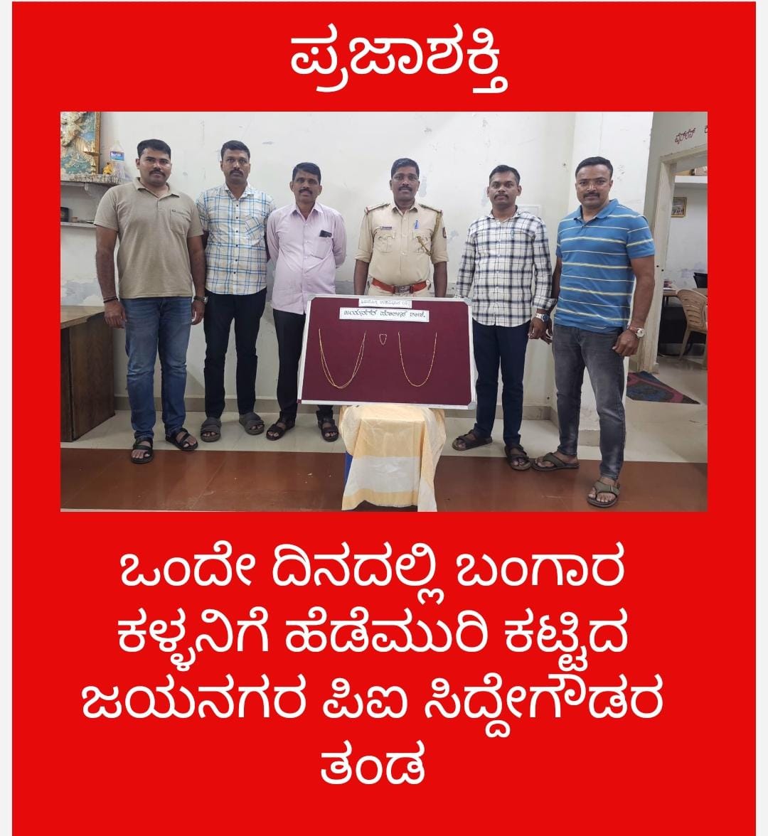 ಸದರಿ ಪ್ರಕರಣದಲ್ಲಿ ಆರೋಪಿ ಮತ್ತು ಮಾಲು ಪತ್ತೆ ಬಗ್ಗೆ ಶಿವಮೊಗ್ಗ ಜಿಲ್ಲಾ ಪೊಲೀಸ್ ಅಧೀಕ್ಷಕರಾದ ಶ್ರೀ ಮಿಥುನ್ ಕುಮಾರ್ ಜಿ. ಕೆ. ಐ.ಪಿ.ಎಸ್ ಹೆಚ್ಚುವರಿ ಪೊಲೀಸ್ ಅಧೀಕ್ಷಕರು - 1 ಶ್ರೀ. ಎ ಜಿ ಕಾರಿಯಪ್ಪ ಮತ್ತು ಹೆಚ್ಚುವರಿ ಪೊಲೀಸ್ ಅಧೀಕ್ಷಕರು - 2 ಶ್ರೀ. ಎಸ್ ರಮೇಶ್ ಕುಮಾರ್, ರವರ ಮಾರ್ಗದರ್ಶನದಲ್ಲಲಿ, ಶಿವಮೊಗ್ಗ ಉಪ ವಿಭಾಗ-ಬಿ ಡಿ ವೈ ಎಸ್ ಪಿ ಶ್ರೀ. ಸಂಜೀವ್ ಕುಮಾರ್ ರವರ ಮಾರ್ಗದರ್ಶನದಲ್ಲಿ ಜಯನಗರ ಪೊಲೀಸ್ ಠಾಣೆ ಪಿ.ಐ. ಶ್ರೀ. ಸಿದ್ದೇಗೌಡ ಹೆಚ್ ಎಂ, ಪಿಎಸ್ಐ ಶ್ರೀಮತಿ ಕೋಮಲ ಬಿ ಆರ್, ಎ ಎಸ್ ಐ ಕರಿಬಸಪ್ಪ ಸಿ ಆರ್ ರವರು ಹಾಗೂ ಸಿಬ್ಬಂದಿಯವರಾದ ಎಚ್ ಸಿ ನಾಗರಾಜ್ ಕೆ, ಸಿ ಪಿ ಸಿ- ವಸಂತ ಜಿ, ಸಚಿನ್ ಎಚ್ ಎಸ್, ವೀರೇಶ್ ಬಿ ಎಂ ರವರನ್ನು ಒಳಗೊಂಡ ತನಿಖಾ ತಂಡವನ್ನು ರಚಿಸಲಾಗಿರುತ್ತದೆ.
