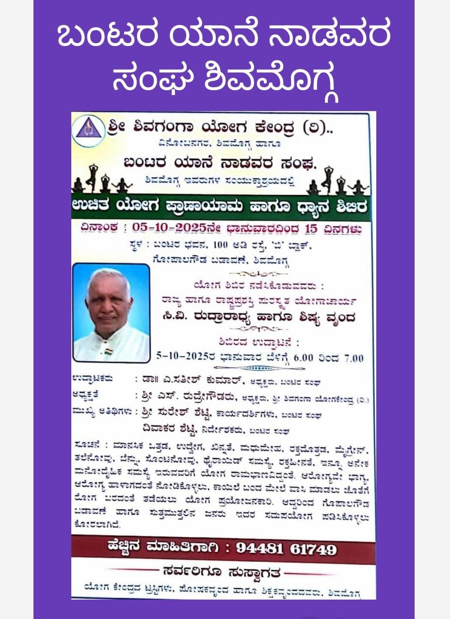 ದಿನಾಂಕ 5-10-2025 ರ ಭಾನುವಾರ ಬೆಳಿಗ್ಗೆ 6:00 ಗಂಟೆಗೆ ಪ್ರಾರಂಭಿಸಿ ಹದಿನೈದು ದಿನಗಳ ಕಾಲ ಶಿವಮೊಗ್ಗ ಬಂಟರ ಭವನದಲ್ಲಿ ಪ್ರತಿನಿತ್ಯ ಯೋಗಾಸನ ಶಿಬಿರ ಹಮ್ಮಿಕೊಳ್ಳಲಾಗಿದೆ.