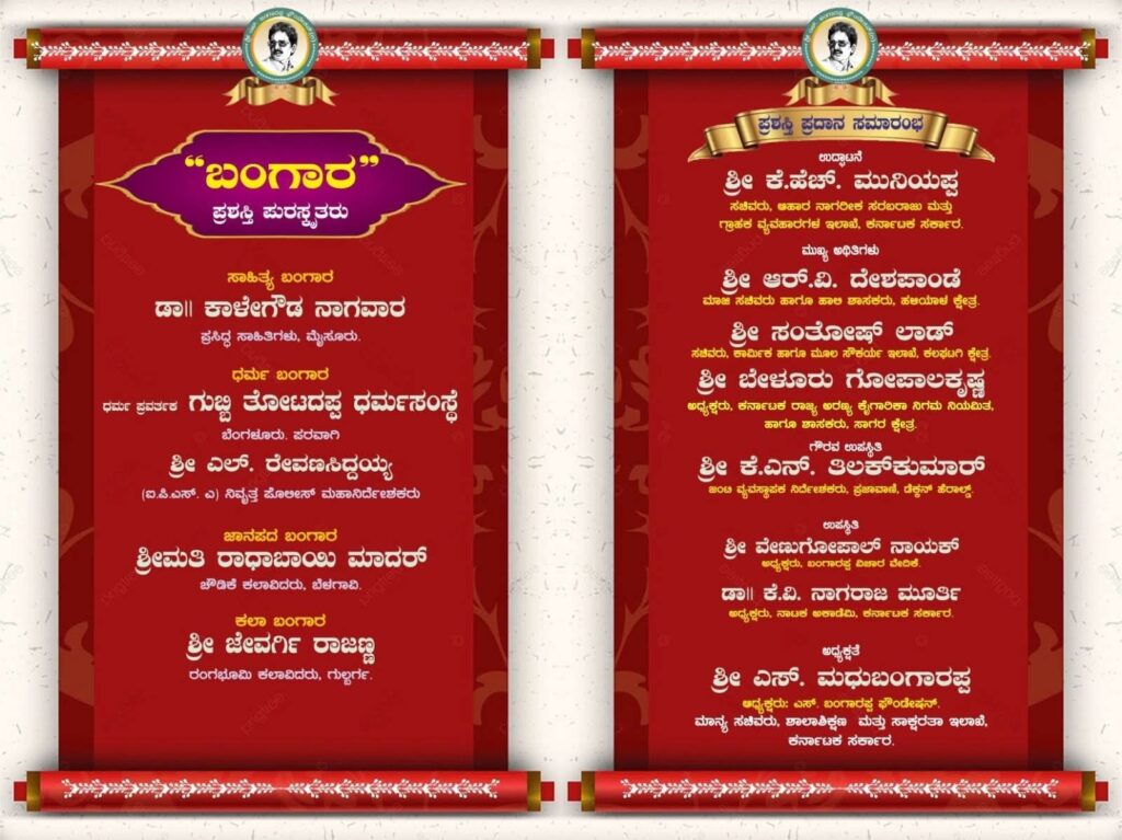 ಶ್ರೀ ಬಂಗಾರಪ್ಪ ಪೌಂಢೇಷನ್ ಮತ್ತು ಶ್ರೀಬಂಗಾರಪ್ಪ ವಿಚಾರ ವೇದಿಕೆ ವತಿಯಿಂದ ಆಯೋಜಿಸಿದ್ದ ಕಾರ್ಯಕ್ರಮದಲ್ಲಿ ಗುಬ್ಬಿ ತೋಟದಪ್ಪ ಛತ್ರ ಸಂಸ್ಥೆಗೆ ಸೇವಾ ಬಂಗಾರ ಪ್ರಶಸ್ತಿ, ಸಾಹಿತಿ ಡಾ. ಕಾಳೇಗೌಡ ನಾಗವಾರ ಅವರಿಗೆ ಸಾಹಿತ್ಯ ಬಂಗಾರ, ಜೀವಣ್ಣ ರಾಜಣ್ಣ ಅವರಿಗೆ ಕಲಾಬಂಗಾರ, ರಾಧಬಾಯಿ ಅವರಿಗೆ ಜಾನಪದ ಬಂಗಾರ ಪ್ರಶಸ್ತಿ ಪ್ರಧಾನ ಮಾಡಲಾಯಿತು.