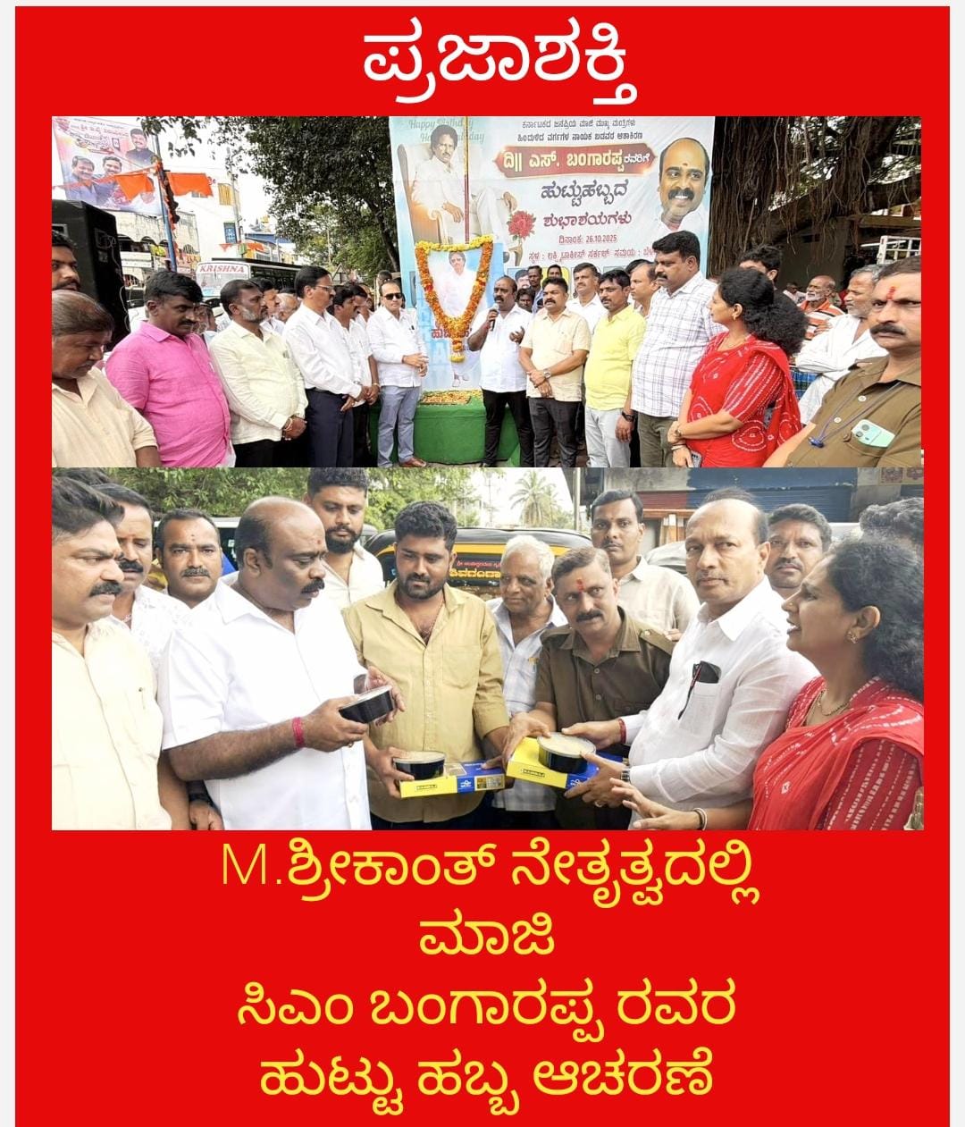 ಕರ್ನಾಟಕದ ಜನಪ್ರಿಯ ಮಾಜಿ ಮುಖ್ಯಮಂತ್ರಿಗಳು, ಹಿಂದುಳಿದ ವರ್ಗದ ಆಶಾಕಿರಣ, ಬಡವರ ಬಂಧು ಧೀಮಂತ ನಾಯಕರಾದ ದಿ || ಎಸ್ ಬಂಗಾರಪ್ಪ ನವರ ಹುಟ್ಟು ಹಬ್ಬದ ಅಂಗವಾಗಿ ಕಾಂಗ್ರೆಸ್ ನಾಯಕರಾದ ಎಂ ಶ್ರೀಕಾಂತ್ ರವರ ನೇತೃತ್ವದಲ್ಲಿ ಶಿವಮೊಗ್ಗ ನಗರದ ಲಕ್ಷ್ಮಿ ಟಾಕೀಸ್ ವೃತ್ತದಲ್ಲಿ 100 ರಕ್ಕೂ ಹೆಚ್ಚು ಆಟೋ ಚಾಲಕರಿಗೆ ಬಟ್ಟೆಯನ್ನು ನೀಡಿ ಊಟವನ್ನು ನೀಡುವ ಮುಖಾಂತರ ಆಚರಣೆ ಮಾಡಲಾಯಿತು.