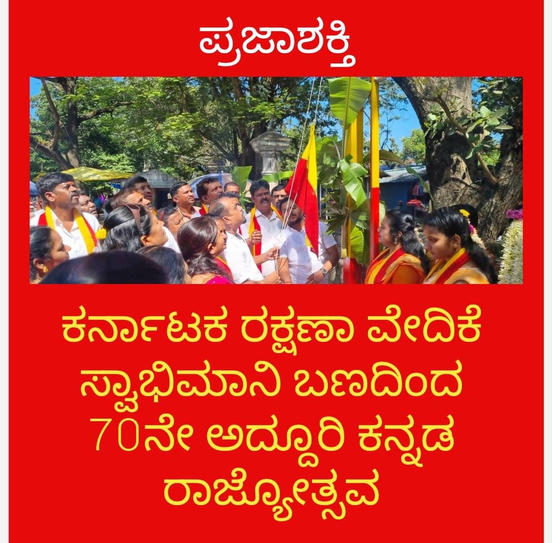 ಕರ್ನಾಟಕ ರಕ್ಷಣಾ ವೇದಿಕೆ ಸ್ವಾಭಿಮಾನಿ ಬಣದಿಂದ 70ನೇ ಕನ್ನಡ ರಾಜ್ಯೋತ್ಸವವನ್ನು ಅದ್ದೂರಿಯಾಗಿ ಆಚರಿಸಲಾಯಿತು.ನಗರದ ಮೆಗ್ಗಾನ್ ಆಸ್ಪತ್ರೆ ಮುಂಬಾಗದ ಶಾಶ್ವತ ದ್ವಜ ಸ್ಥಂಭದಲ್ಲಿ ಆಚರಿಸಲಾಯಿತು.