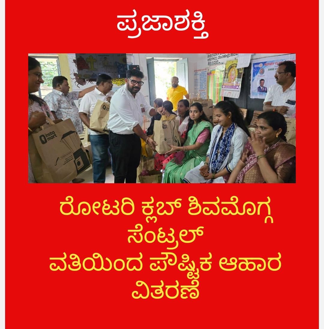 ರೋಟರಿ ಕ್ಲಬ್ ಶಿವಮೊಗ್ಗ ಸೆಂಟ್ರಲ್ ವತಿಯಿಂದ ಶಿವಮೊಗ್ಗದ ಹೊಸಮನೆ ಅಂಗನವಾಡಿ ಕೇಂದ್ರದಲ್ಲಿ ಗರ್ಭಿಣಿ ಮಹಿಳೆಯರಿಗೆ ಪೌಷ್ಟಿಕ ಆಹಾರ ವಿತರಣೆ ಕಾರ್ಯಕ್ರಮ ನಡೆಯಿತು.