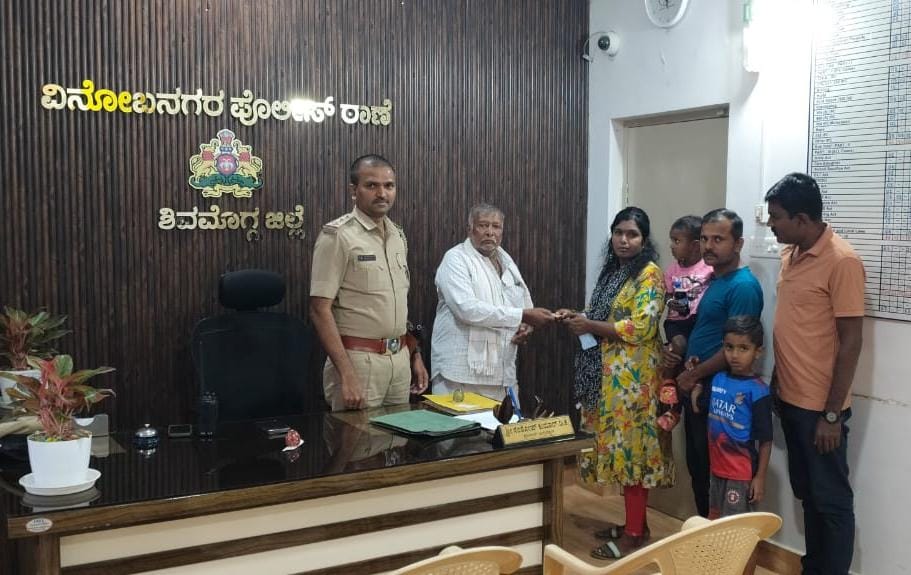 ಮಾಂಗಲ್ಯದ ಸರವನ್ನ ತೀರ್ಥಪ್ಪ ದೇವಕಾತಿಕೊಪ್ಪ ನಿವಾಸಿ ರವರಿಗೆ ಸಿಕ್ಕಿದ್ದು. ನಿನ್ನೆ ಸಂತೋಷ್ ಕುಮಾರ್ ಡಿ ಕೆ, ಪಿಐ ವಿನೋಬನಗರ ರವರ ಮುಖೇನಾ ವಾಪಸ್ಸು ವಾರಸುದಾರರಿಗೆ ಮರಳಿ ನೀಡಿರುತ್ತಾರೆ.