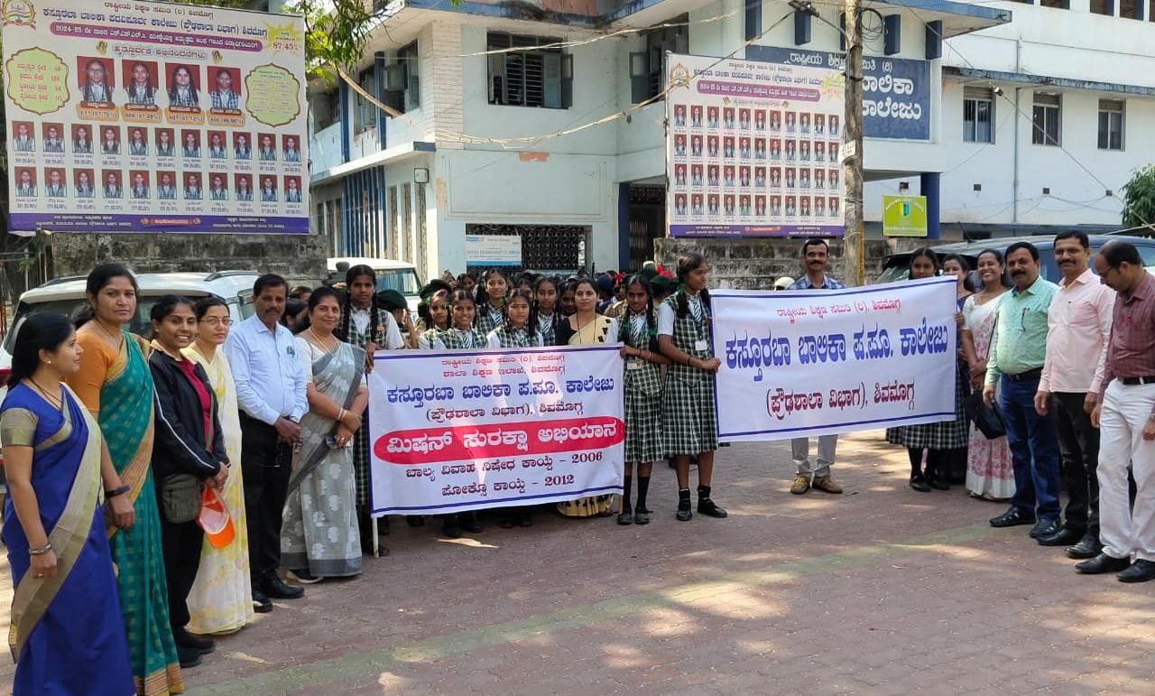 ಶಿವಮೊಗ್ಗ: ಅಪ್ರಾಪ್ತ ವಯಸ್ಸಿನ ವಿವಾಹ, ಕಿರುಕುಳ ಸೇರಿದಂತೆ ಮಹಿಳೆ ಮತ್ತು ಮಕ್ಕಳ ರಕ್ಷಣೆಗಾಗಿ ಸರ್ಕಾರ ಅನುಷ್ಟಾನಗೊಳಿಸಿರುವ ಮಿಷನ್ ಸುರಕ್ಷಾ ಅಭಿಯಾನದ ಕುರಿತು ಸಾರ್ವಜನಿಕರಲ್ಲಿ ಜಾಗೃತಿ ಜಾಥ ಮೂಡಿಸುವ ಸಲುವಾಗಿ ಕಸ್ತೂರಬಾ ಬಾಲಿಕ ಪ್ರೌಢಶಾಲೆಯ ವಿದ್ಯಾರ್ಥಿನಿಯರು, ನಗರದ ಪ್ರಮುಖ ರಸ್ತೆಗಳಲ್ಲಿ ಜಾಗೃತಿ ಜಾಥ ನಡೆಸಿದರು.