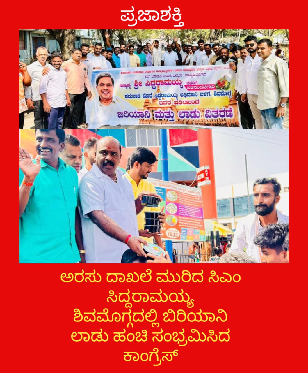 ರಾಜ್ಯದಲ್ಲಿ ಅತಿ ಹೆಚ್ಚು ದಿನಗಳ ಅವಧಿಗೆ ಮುಖ್ಯಮಂತ್ರಿಯಾಗಿ ಅಧಿಕಾರ ನಡೆಸಿದ ದೇವರಾಜ್ ಅರಸು ಅವರ ದಾಖಲೆಯನ್ನು ಮೀರಿ ಸಿಎಂ ಸಿದ್ದರಾಮಯ್ಯ ಹೊಸ ಇತಿಹಾಸ ನಿರ್ಮಿಸಿದ್ದಾರೆ. ಈ ಸಾಧನೆಯ ಹಿನ್ನೆಲೆಯಲ್ಲಿ ಕಾಂಗ್ರೆಸ್ ಕಾರ್ಯಕರ್ತರು ರಾಜ್ಯದಾದ್ಯಂತ ಉತ್ಸಾಹದಿಂದ ಸಂಭ್ರಮಾಚರಣೆ ನಡೆಸುತ್ತಿದ್ದು, ಶಿವಮೊಗ್ಗದಲ್ಲೂ ವಿಶೇಷವಾಗಿ ಕಾಂಗ್ರೆಸ್ ಮುಖಂಡ ಎಂ ಶ್ರೀಕಾಂತ್ ನೇತೃತ್ವದಲ್ಲಿ ಬಸ್ಟ್ಯಾಂಡ್ ವೃತ್ತದಲ್ಲಿ ಸಾರ್ವಜನಿಕರಿಗೆ ಬಿರಿಯಾನಿ ಮತ್ತು ಲಡ್ಡು ವಿತರಣೆ ಮಾಡಿದರು.