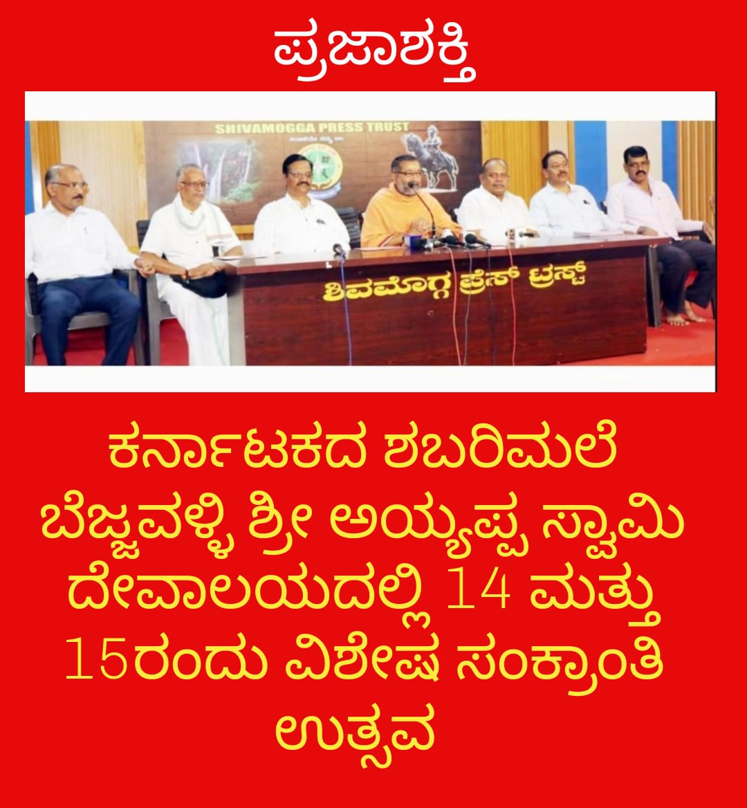 ಕರ್ನಾಟಕದ ಶಬರಿಮಲೆ ಹಿಂದೆ ಪ್ರಸಿದ್ಧವಾಗಿರುವ ತೀರ್ಥಹಳ್ಳಿ ತಾಲ್ಲೂಕು ಬೆಜ್ಜುವಳ್ಳಿಯ ಶ್ರೀ ಅಯ್ಯಪ್ಪಸ್ವಾಮಿ ಧಾರ್ಮಿಕ ದತ್ತಿ ವತಿಯಿಂದ ಜ. 14 ಮತ್ತು 15ರಂದು ವಿಶೇಷ ಮಕರ ಸಂಕ್ರಾಂತಿ ಮಹೋತ್ಸವ ಮತ್ತು ಶ್ರೀಗಳ ಪೀಠಾರೋಹಣದ ವರ್ಧಂತ್ಯೋತ್ಸವ ಸಮಾರಂಭ ಆಯೋಜಿಸಲಾಗಿದೆ ಎಂದು ದೇವಸ್ಥಾನದ ಪೀಠಾಧಿಪತಿ ಡಾ. ಶ್ರೀ ಶ್ರೀ ಶ್ರೀ ವಿಶ್ವ ಸಂತೋಷ ಭಾರತಿ ಶ್ರೀಪಾದರು ಹೇಳಿದರು.