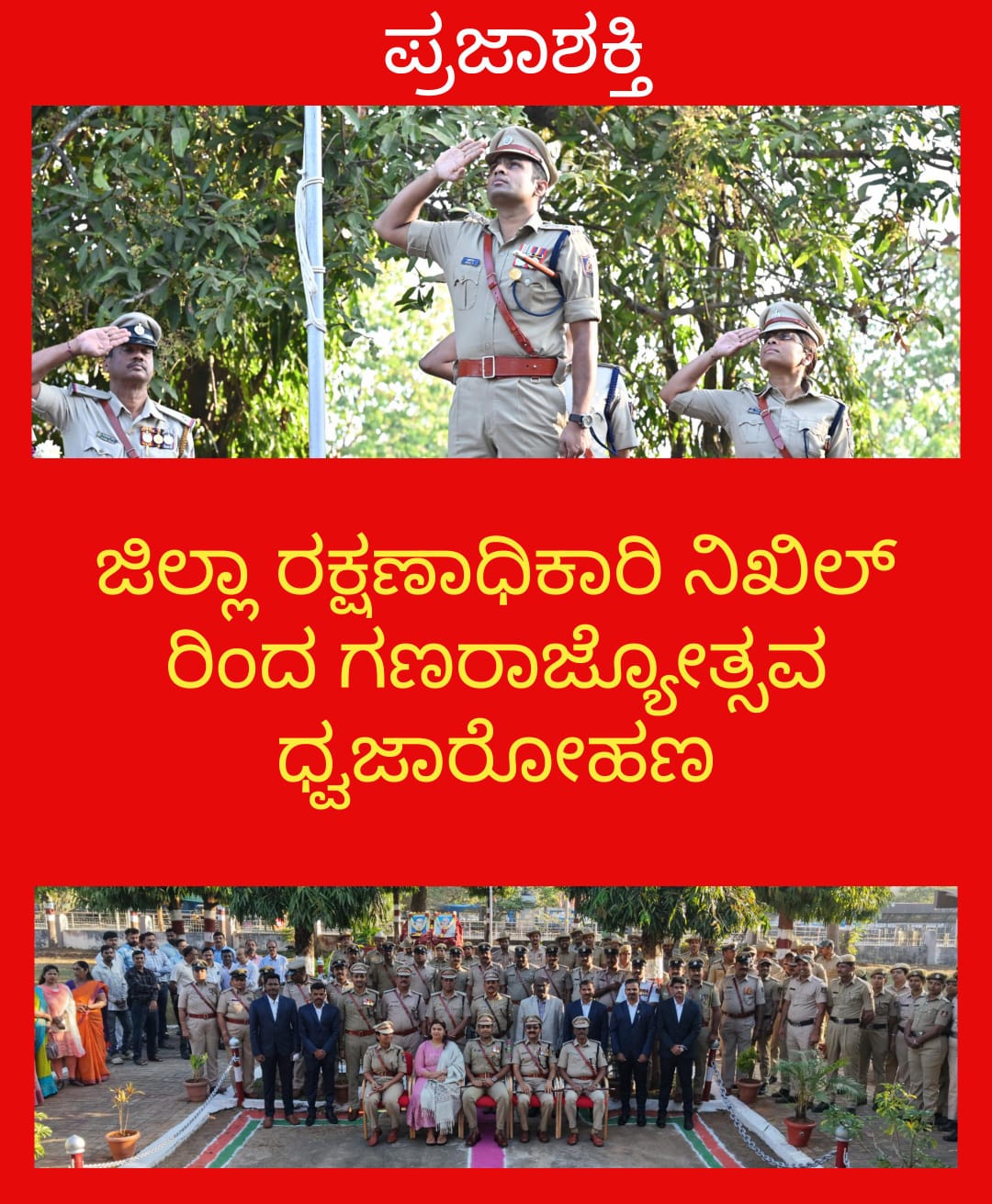 77ನೇ ಗಣರಾಜ್ಯೋತ್ಸವದ ಅಂಗವಾಗಿ ಶಿವಮೊಗ್ಗ ಜಿಲ್ಲಾ ಪೊಲೀಸ್ ಕಛೇರಿಯಲ್ಲಿ ಶ್ರೀ ನಿಖಿಲ್, ಬಿ, ಐಪಿಎಸ್, ಪೊಲೀಸ್ ಅಧೀಕ್ಷಕರು ಶಿವಮೊಗ್ಗ ಜಿಲ್ಲೆ ರವರು ದ್ವಜಾರೋಹಣಾವನ್ನು ನೆರವೇರಿಸಿದರು.