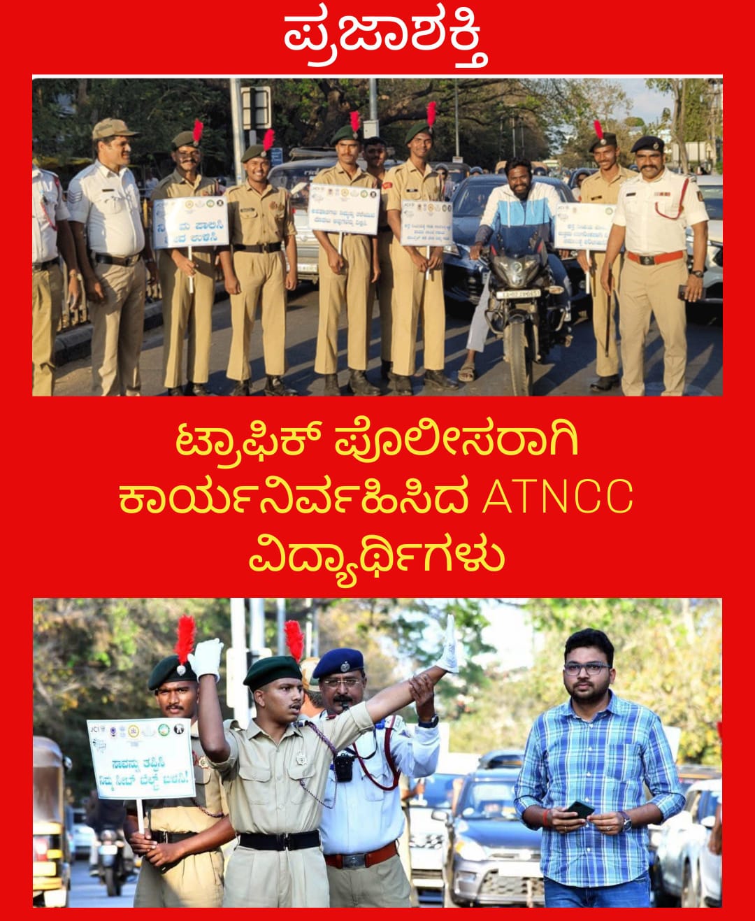 ಎ.ಟಿ.ಎನ್.ಸಿ.ಸಿ ಹಾಗೂ ಕಮಲಾ ನೆಹರು ಕಾಲೇಜಿನ ಎನ್.ಸಿ.ಸಿ ಹಾಗೂ ರೇಂಜರ್ಸ್ ರೋವರ್ಸ್ ವಿದ್ಯಾರ್ಥಿಗಳು ಸಂಚಾರಿ ಪೊಲೀಸರಾಗಿ ವೃತ್ತ ಮಧ್ಯೆ ನಿಂತು ಕೈ ಸಂಕೇತಗಳನ್ನು ತೋರಿಸುತ್ತ ಸಂಚಾರ ದಟ್ಟಣೆ ನಿಯಂತ್ರಿಸಿದರು. ಬಿತ್ತಿ ಪತ್ರಗಳನ್ನು ಹಿಡಿದು ವಾಹನ ಸವಾರರಲ್ಲಿ ಜಾಗೃತಿ ಮೂಡಿಸಿದರು. ವೃತ್ತದಲ್ಲಿ ಜೀಬ್ರಾ ಲೈನ್ ದಾಟಿದ ಸವಾರರಿಗೆ, ವೃತ್ತದಲ್ಲಿ ಸರಿಯಾಗಿ ನಿಲ್ಲುವ ಬಗೆ ವಿವರಿಸುತ್ತಾ, ಅವಸರವೇ ಅಪಘಾತಕ್ಕೆ ಕಾರಣವೆಂದು ತಿಳಿಹೇಳಿದರು.