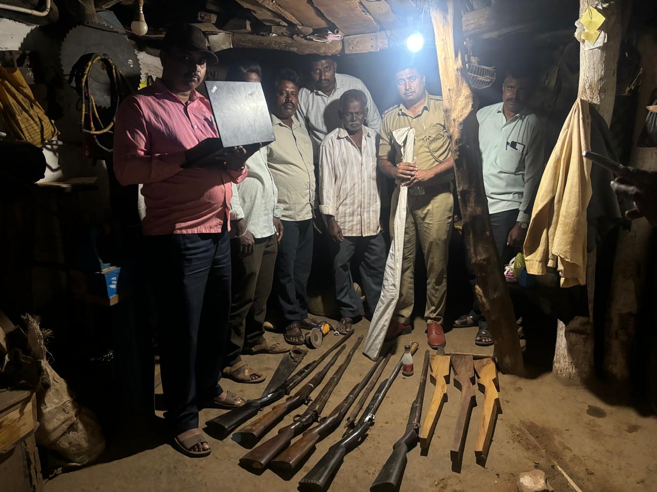 ಲಕ್ಷ್ಮಣಪ್ಪ ಎಂಬ ಕಾರ್ಪೆಂಟರ್ ಅವರ ಮನೆಗೆ ನ್ಯಾಯಾಲಯದ ಸರ್ಚ್ ವಾರೆಂಟ್ ಮೂಲಕ ದಾಳಿ ನಡೆಸಲಾಗಿತ್ತು ದಾಳಿಯಲ್ಲಿ ಏಳು ನಾಡ ಬಂದೂಕುಗಳು ಪತ್ತೆಯಾಗಿವೆ. ಹಾಗೂ ಅದಕ್ಕೆ ಸಂಬಂಧಪಟ್ಟಂತಹ ವಸ್ತುಗಳು ಸಹ ಪತ್ತೆಯಾಗಿದ್ದು ಆರೋಪಿತನನ್ನು ವಶಕ್ಕೆ ಪಡೆಯಲಾಗಿದೆ.