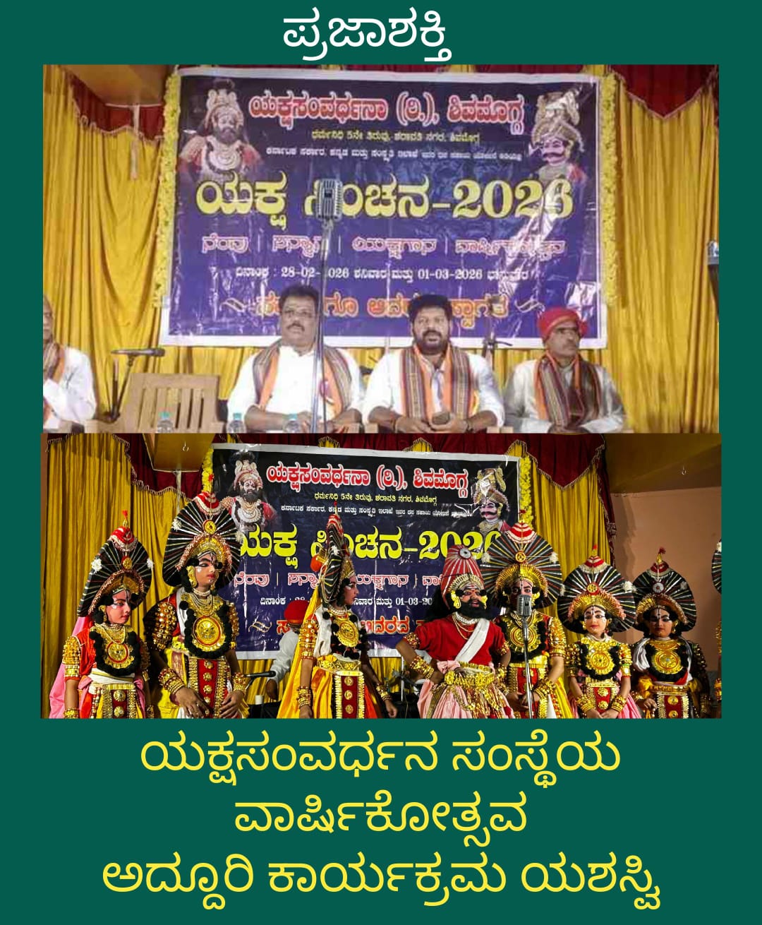 ಶಿವಮೊಗ್ಗದ ಪ್ರತಿಷ್ಠಿತ ಯಕ್ಷಸಂವರ್ಧನ ಸಂಸ್ಥೆಯ ವಾರ್ಷಿಕೋತ್ಸವ ಯಕ್ಷಸಿಂಚನ-2026 ಸೋಮಿನಕೊಪ್ಪದ ಶ್ರೀ ಪಂಚಮುಖಿ ಆಂಜನೇಯ ಮತ್ತು ಬನಶಂಕರಿ ಅಮ್ಮನವರ ದೇವಸ್ಥಾನ ಮತ್ತು ರವೀಂದ್ರ ನಗರದ ಶ್ರೀ ಪ್ರಸನ್ನ ಗಣಪತಿ ದೇವಸ್ಥಾನದಲ್ಲಿ ನಡೆಯಿತು.