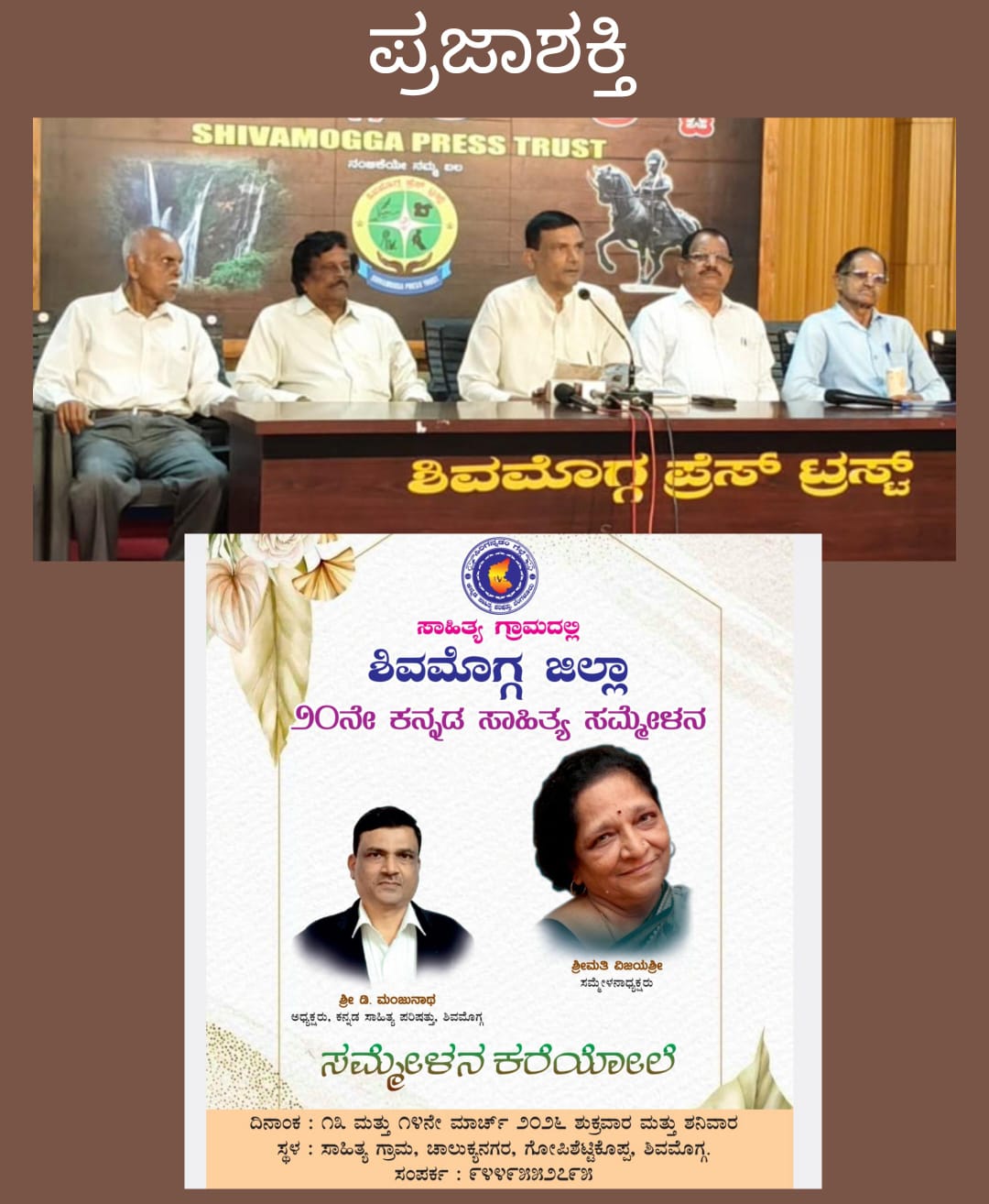 ಶಿವಮೊಗ್ಗ : ಜಿಲ್ಲಾ ಕನ್ನಡ ಸಾಹಿತ್ಯ ಪರಿಷತ್ತಿನ ವತಿಯಿಂದ ಚಾಲುಕ್ಯ ನಗರದ ಸಾಹಿತ್ಯ ಗ್ರಾಮದಲ್ಲಿ ಮಾರ್ಚ್ 13, 14 ರ ಶುಕ್ರವಾರ, ಶನಿವಾರ ಎರಡು ದಿನಗಳ ಜಿಲ್ಲಾ 20 ನೇ ಕನ್ನಡ ಸಾಹಿತ್ಯ ಸಮ್ಮೇಳನ ಏರ್ಪಡಿಸಲಾಗಿದ್ದು, ಹಿರಿಯ ಸಾಹಿತಿ ವಿಜಯಶ್ರೀ ಅವರ ಸರ್ವಾಧ್ಯಕ್ಷತೆಯಲ್ಲಿ ನಡೆಯಲಿದೆ ಎಂದು ಕಸಾಪ ಜಿಲ್ಲಾ ಅಧ್ಯಕ್ಷರಾದ ಡಿ. ಮಂಜುನಾಥ ತಿಳಿಸಿದ್ದಾರೆ.