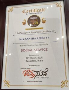 ಅದನ್ನು ಪರಿಗಣಿಸಿ ರಾಜ್ಯದ ಪ್ರತಿಷ್ಠಿತ ಚಿತ್ರ ಸಂಸ್ಥೆ ಸಿನಿಮಾ ಸಂಸ್ಕೃತಿ ಸಂಭ್ರಮ ಸಂಸ್ಥೆ ವತಿಯಿಂದ ಸಮಾಜ ಸೇವೆ ಮತ್ತು ಕಲಾ ಸೇವೆಯ ಸಾಧನೆಗಾಗಿ ಬೆಂಗಳೂರಿನಲ್ಲಿ ನಡೆದ ಸಮಾರಂಭದಲ್ಲಿ ಶಿವಮೊಗ್ಗದ ಶಾಂತ ಶೆಟ್ಟಿ ರವರಿಗೆ ವೀರವನಿತೆ-2026 ಪ್ರಶಸ್ತಿ ನೀಡಿ ಅಭಿನಂದಿಸಿದರು.