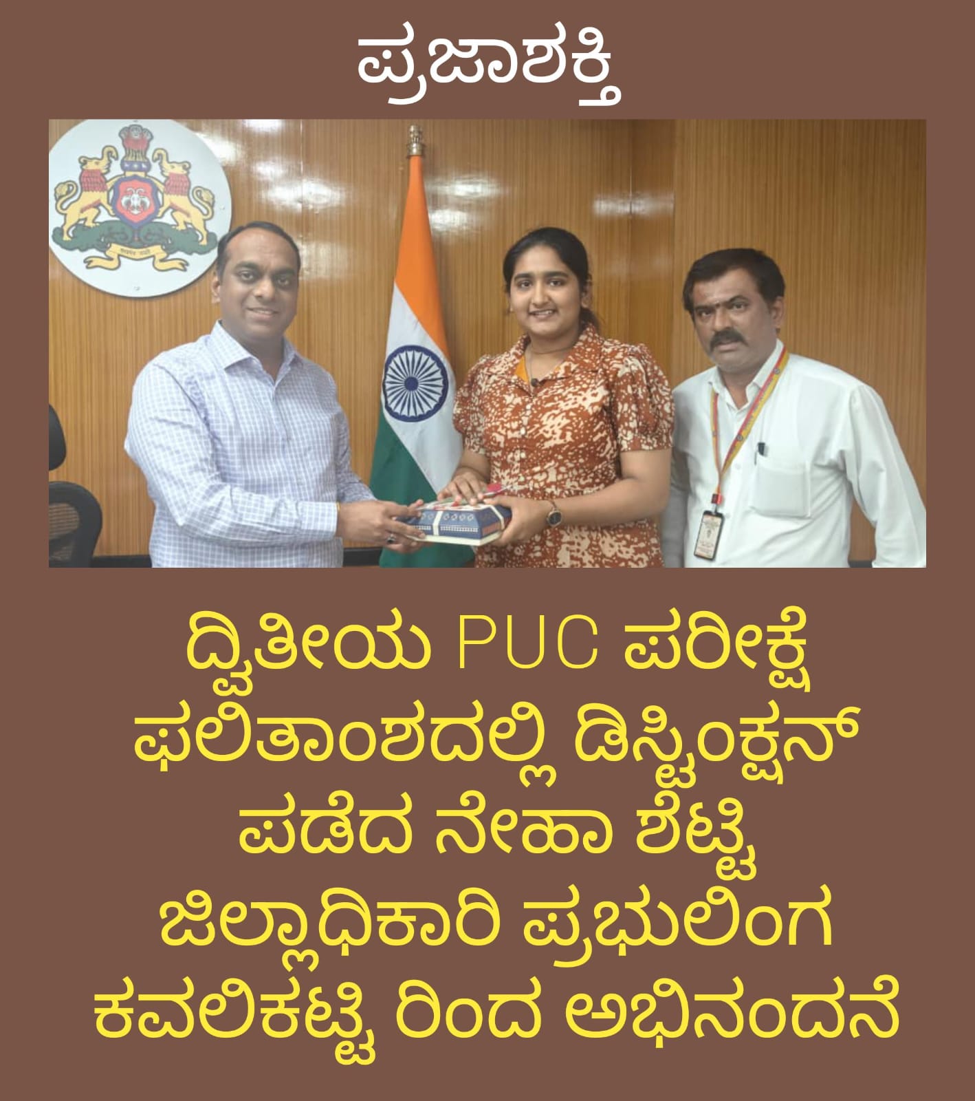 ಜಿಲ್ಲಾಧಿಕಾರಿಗಳ ಕಚೇರಿಯಲ್ಲಿ ಕಾರ್ಯನಿರ್ವಹಿಸುತ್ತಿರುವ ಗ್ರೂಪ್-ಡಿ ನೌಕರರಾದ ಕೀರ್ತಿ ಎಸ್ ಶೆಟ್ಟಿ ರವರ ಪುತ್ರಿ ನೇಹಾ.ಕೆ ಶೆಟ್ಟಿ ಇವರು ಪಿಯುಸಿ ಯಲ್ಲಿ ಉನ್ನತ ಶ್ರೇಣಿ(ಡಿಸ್ಟಿಂಕ್ಷನ್) ಪಡೆದ ಹಿನ್ನೆಲೆಯಲ್ಲಿ ಜಿಲ್ಲಾಧಿಕಾರಿಗಳಾದ ಪ್ರಭುಲಿಂಗ ಕವಳಿಕಟ್ಟಿಯವರು ವಿದ್ಯಾರ್ಥಿನಿಯನ್ನು ತಮ್ಮ ಕಚೇರಿಗೆ ಆಹ್ವಾನಿಸಿ ಆತ್ಮೀಯವಾಗಿ ಸನ್ಮಾನಿಸಿದರು.