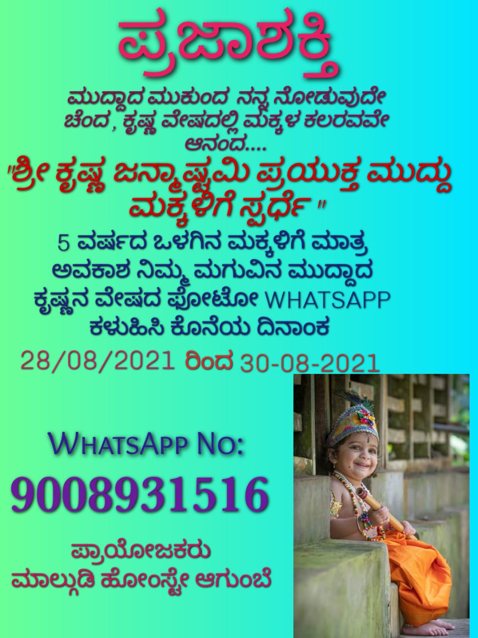 ಶ್ರೀಕೃಷ್ಣ ಜನ್ಮಾಷ್ಟಮಿ ಸ್ಪರ್ಧೆಯನ್ನು ಓದುಗರ ಕೋರಿಕೆಯ ಮೇರೆಗೆ ಸ್ಪರ್ಧೆಯನ್ನು ದಿನಾಂಕ 28-08-2021 ರಿಂದ 30-08-2021ರ ಮಧ್ಯಾಹ್ನ 2.00 ವರೆಗೆ ಮುಂದುವರೆಸಲಾಗಿದೆ.